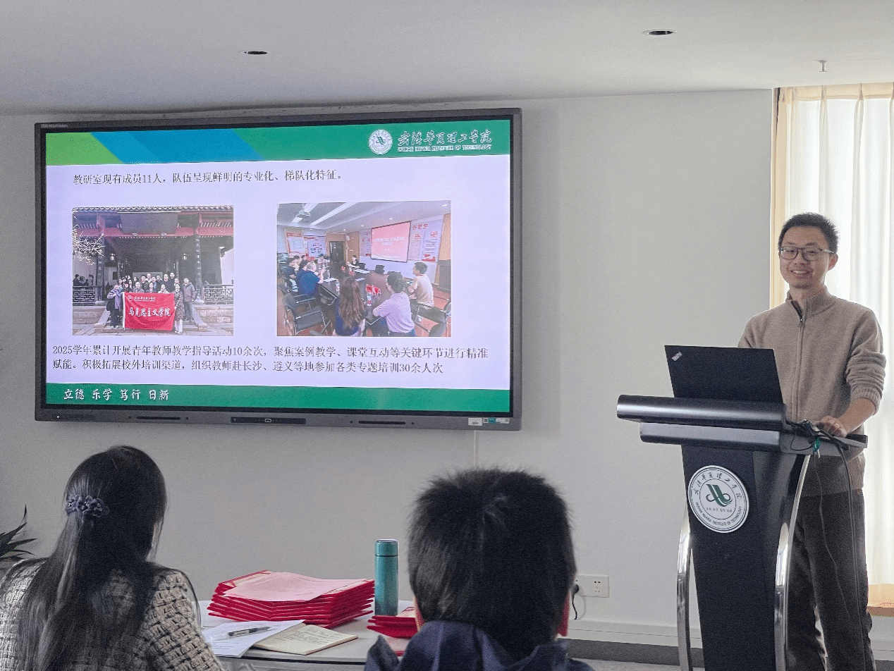 道法纲要教研室主任杨琦,从队伍建设、教学工作、科研竞赛和特色亮点四个方面做工作总结。该教研室通过建立常态化集体备课机制,每两周开展一次教学研讨,集中打磨教学案例、小组讨论等核心环节,组织公开课6次,示范课1次,有效提升了课堂教学的针对性与实效性。积极探索线上线下混合式教学改革,构建“理论教学+实践调研+网络互动”三位一体教学模式。在教科研方面,湖北省教育厅哲学社科立项1项,校级教研项目1项,发表学术论文4篇。杨琦带领团队深耕红色文化与思政课融合领域,指导学生完成两篇调研报告、参与大学生创新创业训练计划,多次斩获省级比赛奖项,指导竞赛成果丰硕。栗佳钰以《思想道德与法治》课程入围全国高校思想政治理论课教学展示活动省级复赛,贾博妍在全国民办高校思想政治理论课青年教师展示大赛中荣获二等奖,充分展现了教研室教师的教学实力。