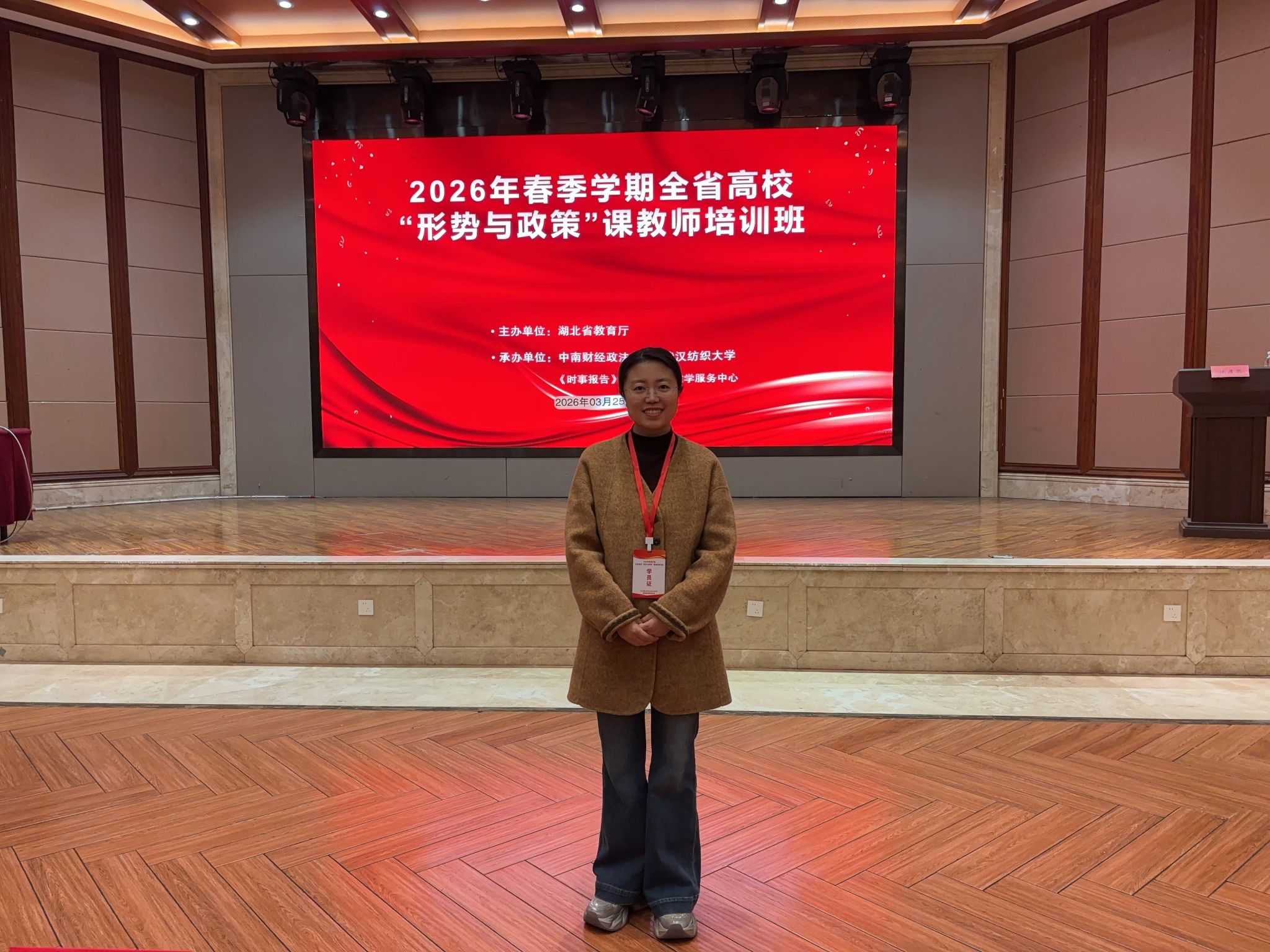为深入学习贯彻党的创新理论,准确把握国内外发展大势,进一步提升“形势与政策”课教学实效,2026年3月27日至28日,由中南财经政法大学、武汉纺织大学、《时事报告》杂志社湖北教学服务中心联合承办的2026年春季学期湖北省高校“形势与政策”课培训班在武汉顺利举行,马克思主义学院选派教师代表刘文莉参加了此次培训。