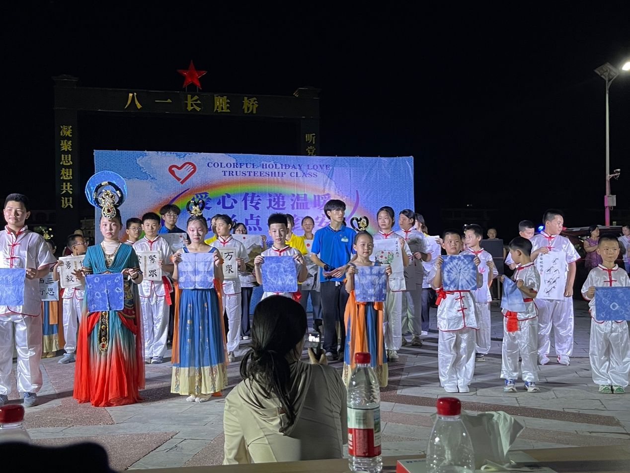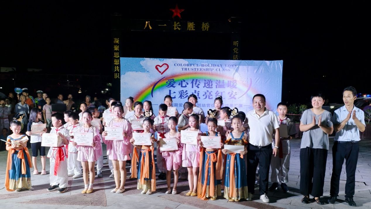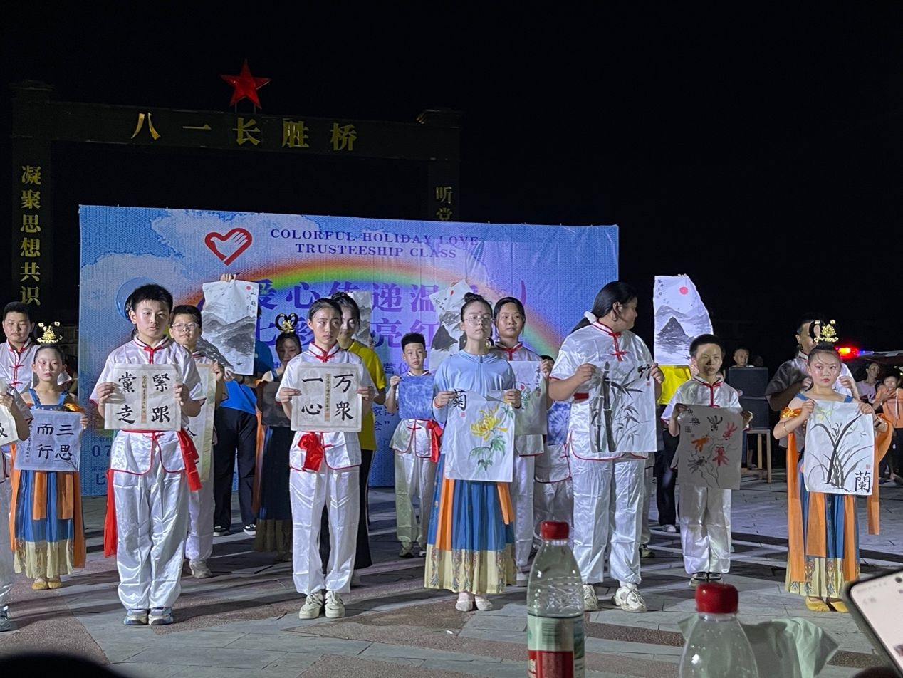 19点30分,八一长胜桥前灯光汇聚、人潮攒动,桥头广场即将举办“爱心传递温暖,七彩点亮红安”——七彩假期爱心托管班结营仪式暨成果汇演。小演员和支教老师们整装以待,观演村民和到访教师们翘首以盼,现场各方的热情仿佛让大家忘却了炎炎高温,树上的知了似乎也在为小演员们加油鼓劲。