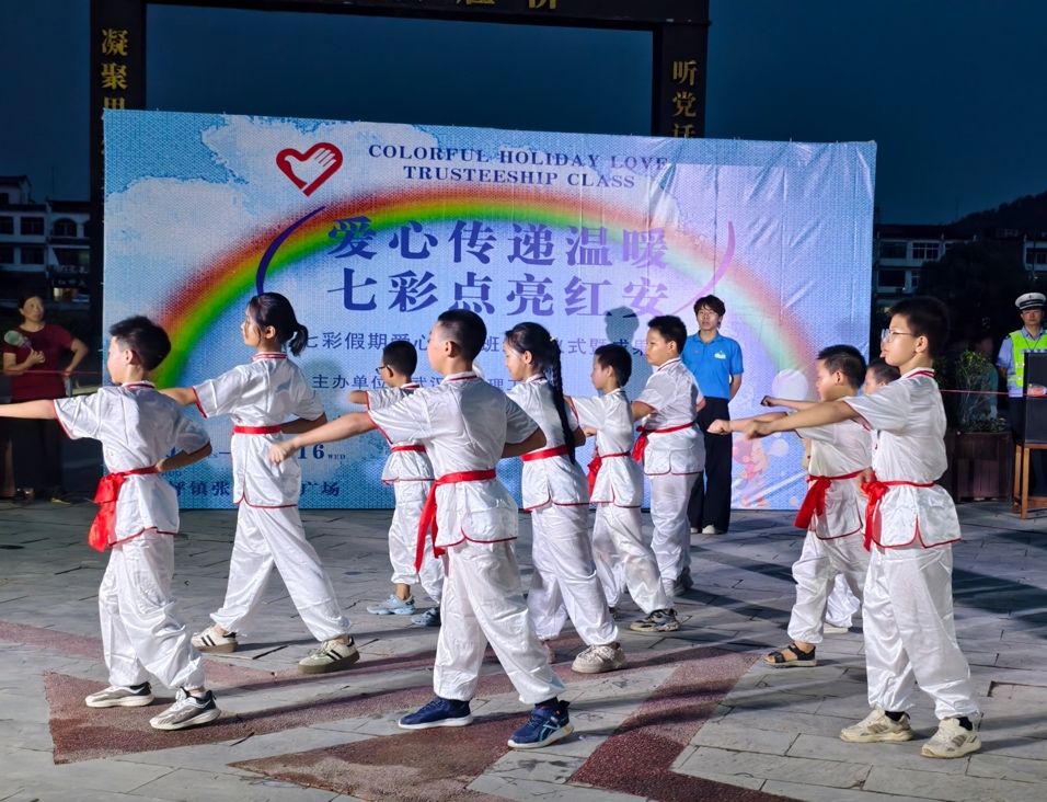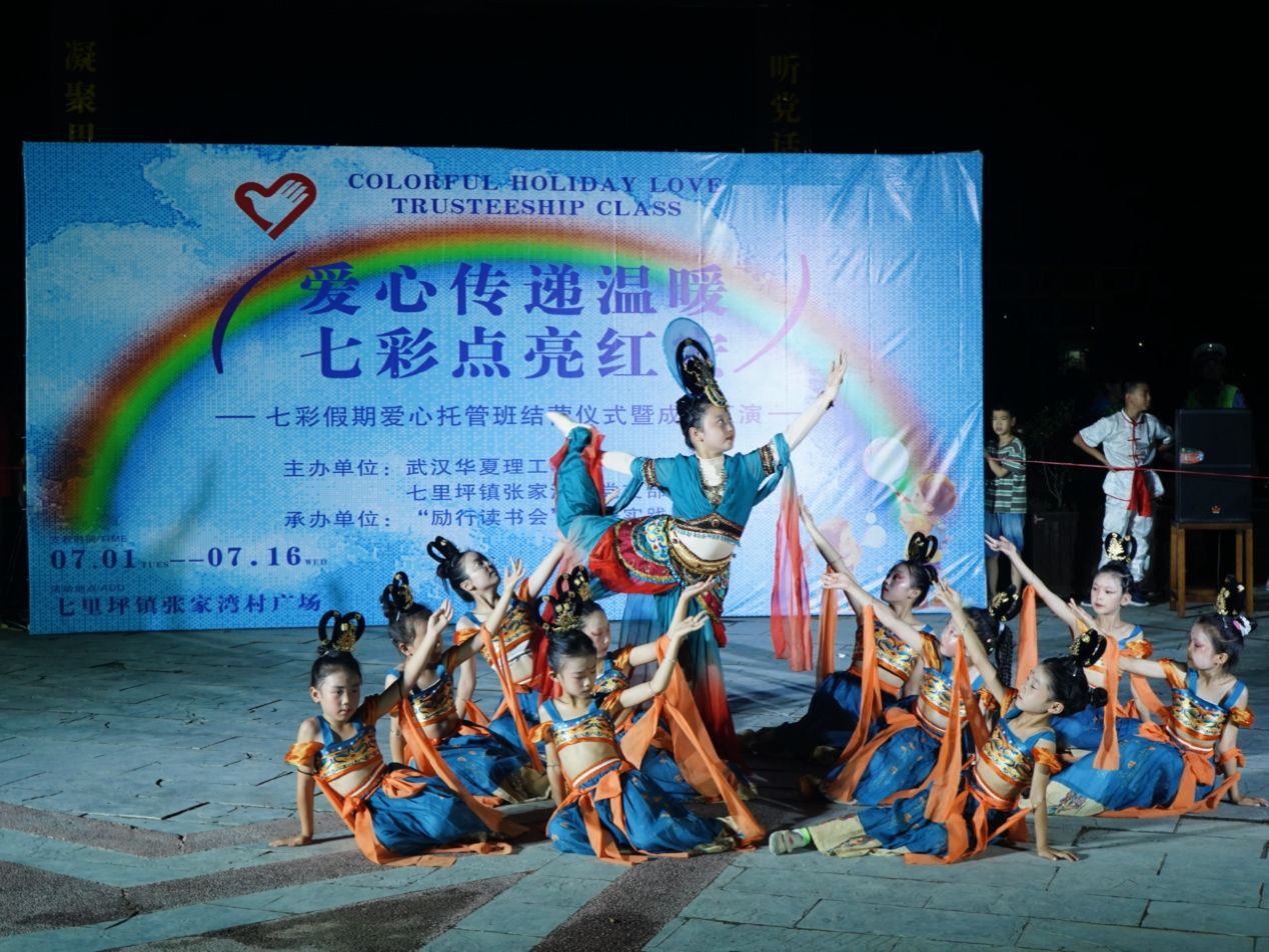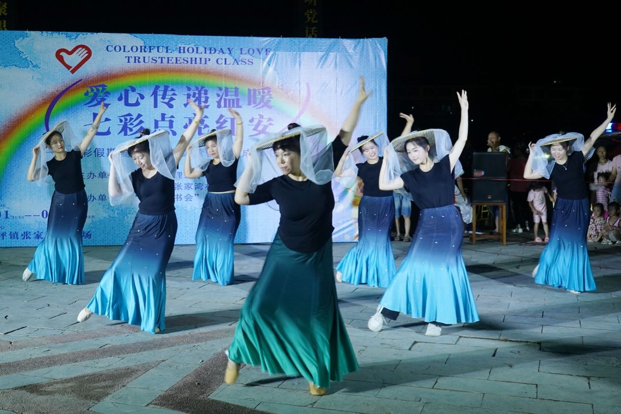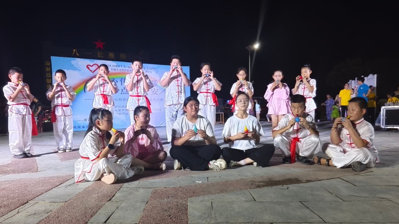 19点30分,八一长胜桥前灯光汇聚、人潮攒动,桥头广场即将举办“爱心传递温暖,七彩点亮红安”——七彩假期爱心托管班结营仪式暨成果汇演。小演员和支教老师们整装以待,观演村民和到访教师们翘首以盼,现场各方的热情仿佛让大家忘却了炎炎高温,树上的知了似乎也在为小演员们加油鼓劲。