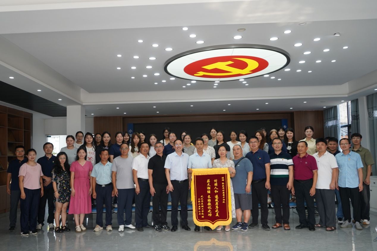 张书记代表学院向张家湾村委会赠送锦旗,感谢他们对“励行读书会”暑期社会实践活动的鼎力支持。张家湾村委会成员与武汉华夏理工学院教职工们合影留念。