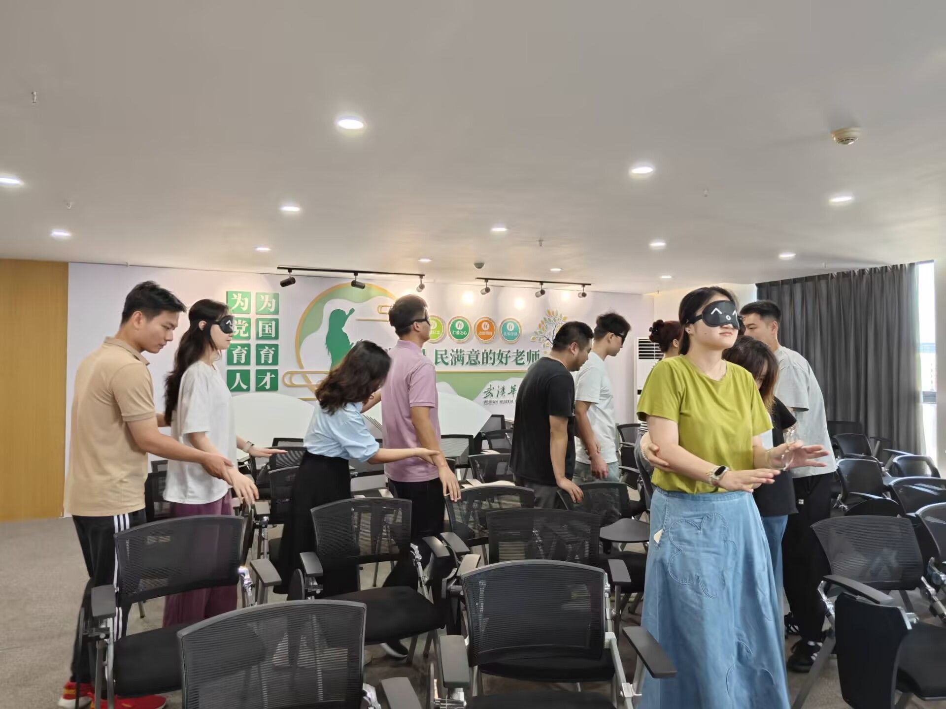 会议首项议程为集体备课环节。韩志来主任以“沉浸式体验”为切入点,带领团队开展热身活动示范,通过“放松按摩”游戏迅速活跃现场氛围。随后,他详细解读实践课分组原则,按照不同人数、沟通需求进行班级分组。在主体活动“盲行”演示中,韩主任邀请教师代表扮演“引导者”与“盲者”,通过蒙眼行走、信任对话等环节,直观呈现课程设计意图。参会教师围绕场地安全、突发干预等细节展开研讨,为大学生心理健康课程的有序开展提供了保障。