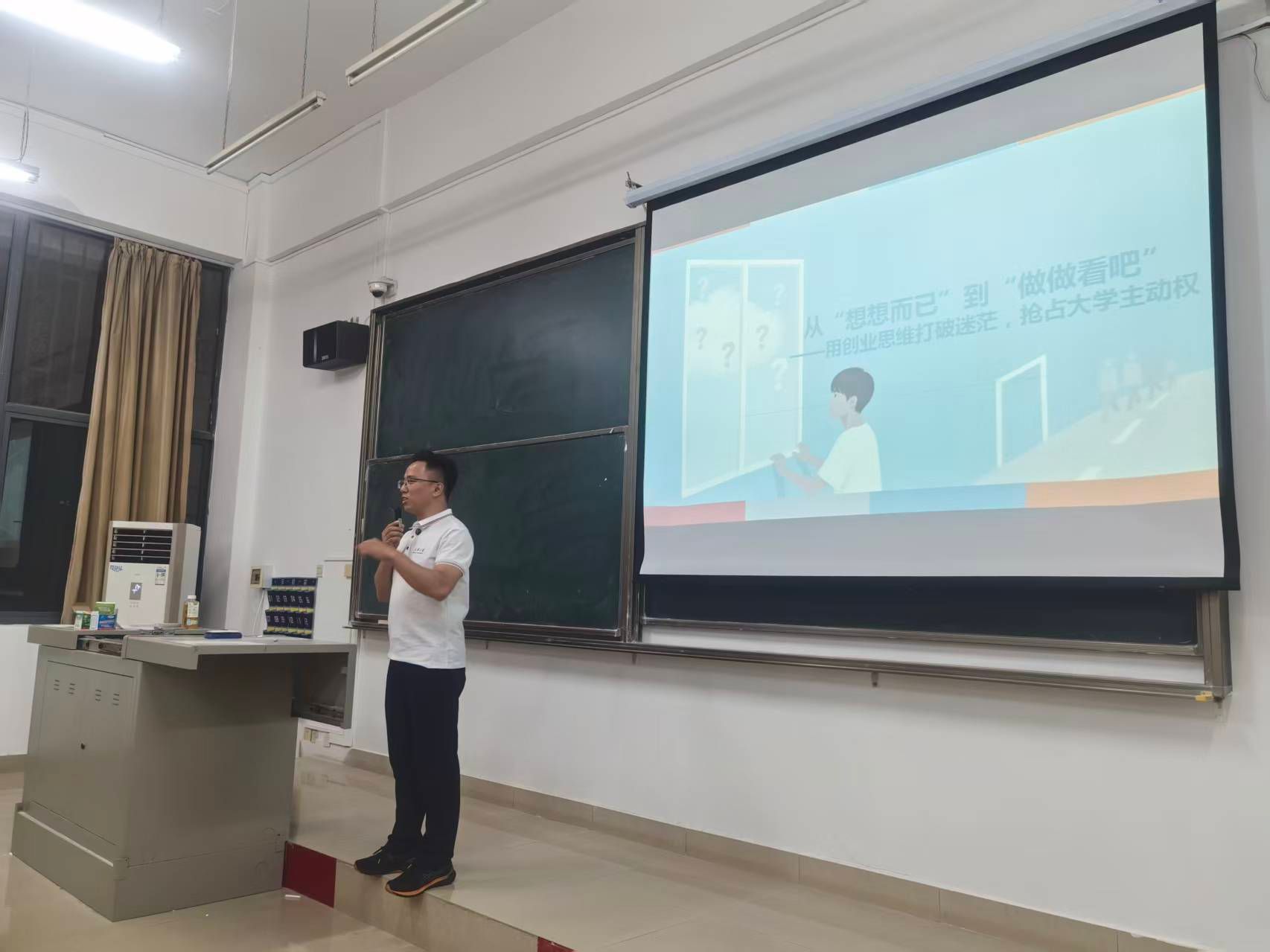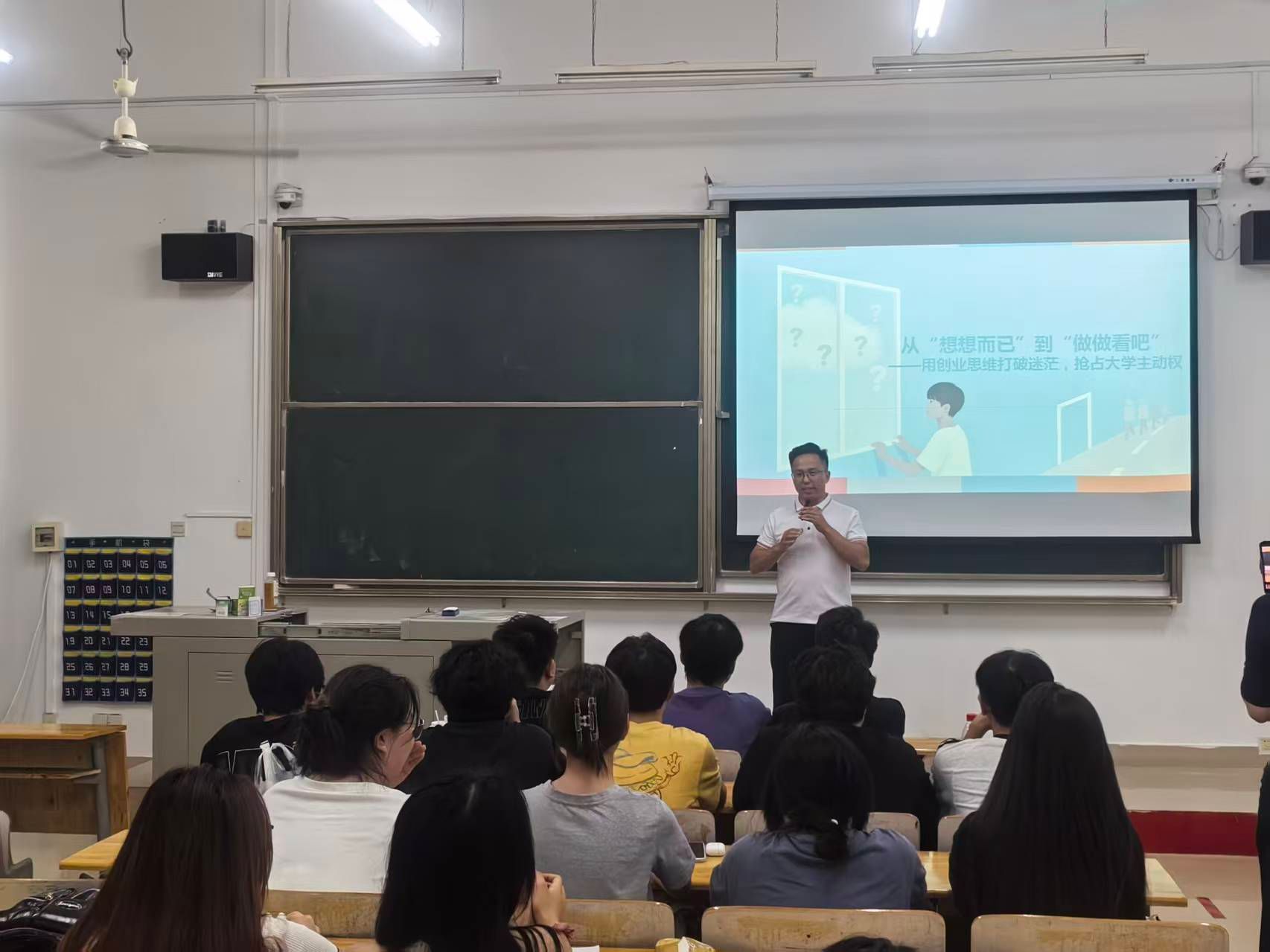 2025年9月8日晚上,创业教育课程邀请企业专家——武汉东途教育科技创始人卢成方来校分享创业经验。卢总是武汉大学工商管理硕士,也是武汉市民进教育支部副主委。他分享的主题是从“想想而已”到“做做看吧”——用创业思维打破迷茫,抢占大学主动权。