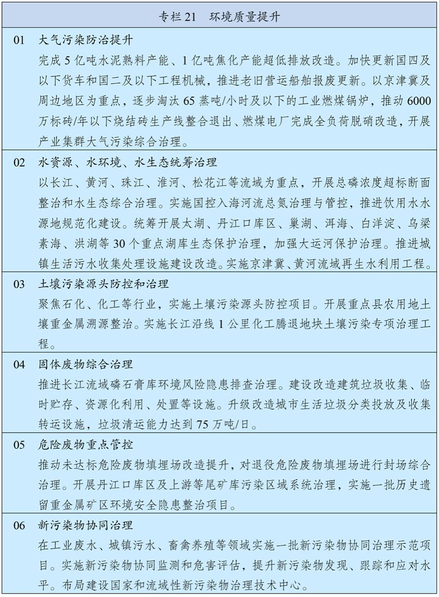 持续深入推进污染防治攻坚,以更高标准改善大气、水、土壤环境质量。以京津冀及周边、长三角、汾渭平原等重点区域为主战场,强化细颗粒物(PM2.5)控制,深入推进重点行业超低排放改造,推动挥发性有机物源头替代和全流程治理,制定下一阶段机动车排放和油品质量标准,深化大气环境绩效分级管理,氮氧化物、挥发性有机物排放量分别下降8%以上,进一步消除重污染天气。加强长江中游、成渝等区域大气污染防治。加强餐饮油烟、恶臭异味和环境噪声污染治理。统筹水资源、水环境、水生态治理,以解决全流域和跨省界突出问题为重点,加强重要江河湖库系统治理和生态保护,基本完成重点流域海域入河入海排污口排查整治,化学需氧量、总磷排放量分别下降6%,巩固城市黑臭水体治理成效、基本消除县乡黑臭水体。加强土壤污染源头防控,推进受污染耕地、建设用地安全利用。
