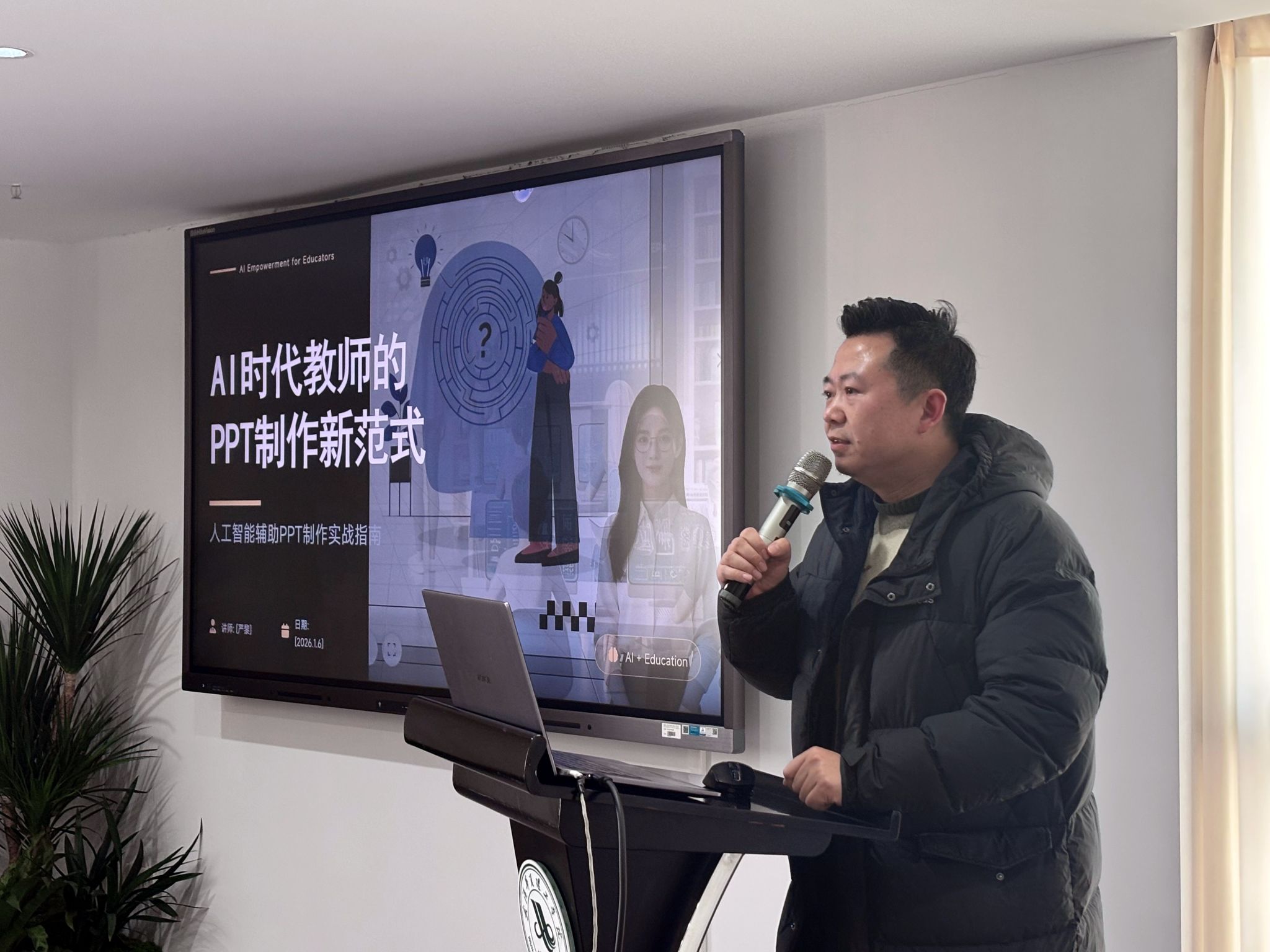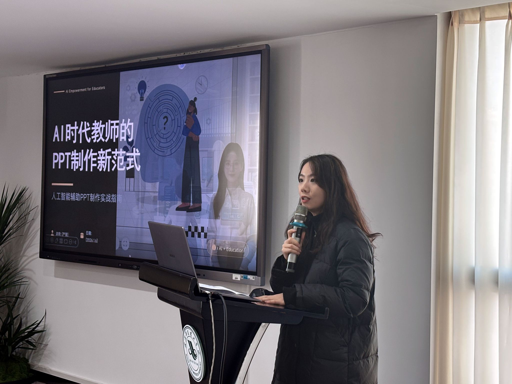 1月7日下午,由教师发展中心和教务部联合主办的第二期“青年教师智慧教学能力培训”在综合楼1401会议室成功举办。本次活动聚焦“AI辅助PPT制作实战指南”核心主题,邀请艺术设计与传媒学院严黎副教授担任主讲嘉宾,为青年教师带来了一场内容丰富、实用性强的智慧教学技能工作坊,教务部副部长何忧主持活动。