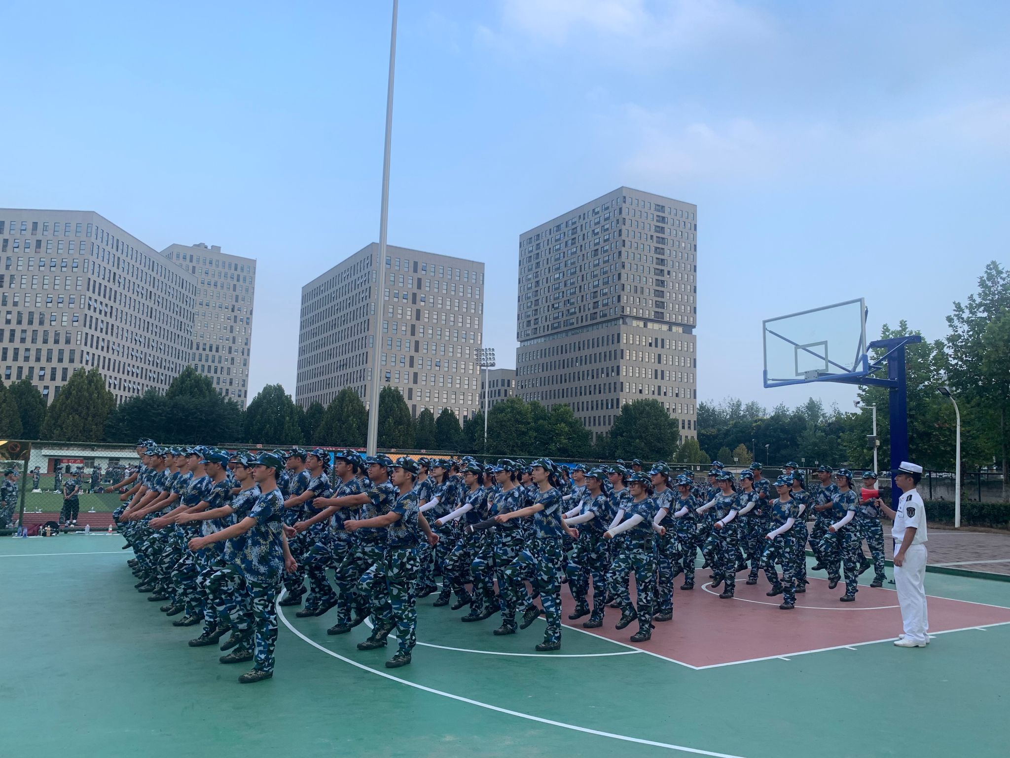 为加强新生军训的时效性和针对性,我校不断丰富、拓展军训方案。就在今天开展了军事理论课程,让新生们了解中国国防、军事思想、世界军事、车事高科技、高技术战争、综合训练。讲的主要是有关军队和战争的概念、范畴、原理、原则等的体系。对新生们进行集中军事技能训练和军事理论课教学 ,是一项具有战略意义的正确决策,它既能体现人才培养和国防后备力量建设的和谐统—,增强学生的国防观念利国防意识 ,培养大学生的基本军事技能,又有力地促进了大学生素质的全面提高。课后同学们仍然积极的投身到军训中,对教官教的每一个姿势要领都认真领会,进行反复训练,做到队伍行列整齐划一,步调一致,一切行动听指挥,新生们一起认真训练,不论多苦多累都没有丝毫退缩,矫健的身姿,挥舞着双臂,在教官的口令中走出了具有气势和活力的步伐。