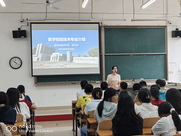 情怀华夏,万里心声。为了让2023级医学检验技术专业新生全面了解本专业的情况,设定正确的学习目标,合理指定学习计划,夯实技能,生物与制药工程学院2023级医学检验技术专业新生专业教育于2023年9月26号上午在2-308教室进行,由医学检验技术系主任杨艾玲进行讲解。