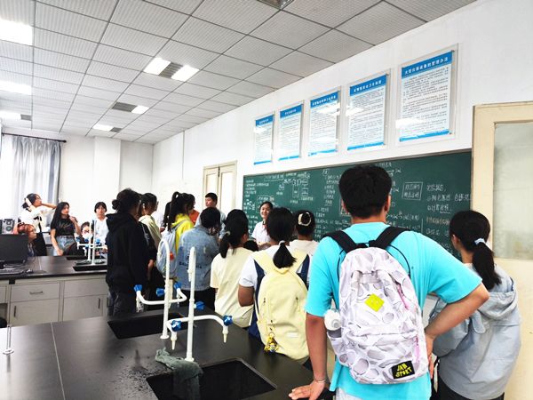 刘老师讲解完后,同学们拾阶而上,在石炎老师和王贝老师的介绍下,依次参观了“四大化学”基础实验室和现代仪器实验室。同学们对实验室内的仪器设备充满了好奇心和求知欲,面对老师们提出的问题同学们均踊跃发言,展现了极大的学习热情。