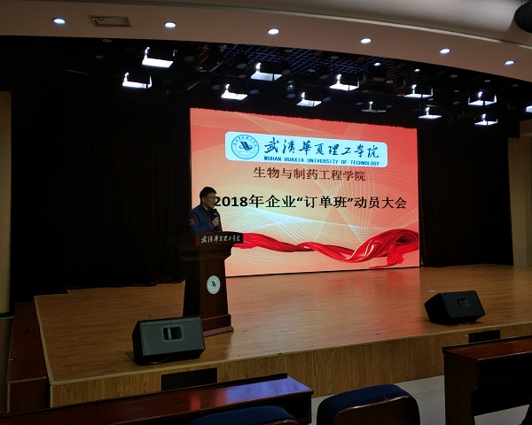 动员大会伊始,龚先军老师进行了发言,他详细地介绍了订单班的意义和作用。订单班的意义在于增强校企合作的力度,深化校企合作,改善学院人才培养的模式。不断提升学生们的专业知识及专业技能,以满足行业岗位需求及时代要求则是订单班的作用。随后,吴春珊老师对浙江我武科技股份有限公司进行了详细的讲解,杨艾玲老师详细介绍了药明康德公司的工作环境、企业类型(主要是生物制药)等一系列情况。付敏老师则为大家详细介绍了武汉致众科技股份有限公司和福普克药业(武汉)有限公司这两个公司的情况。动员大会最后,樊策己老师对订单班的优势进行了讲解,让学生深入了解订单班对于实践教学及专业技术技能人才培养的重要意义。最后他表示,希望同学们能够积极响应订单班的号召,积极参与订单班。