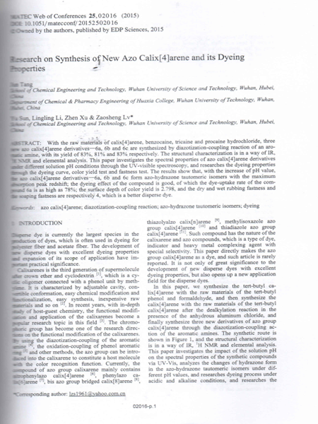 生物与制药工程学院汤军副教授为第一作者撰写的论文《Research on Synthesis of New Azo Calix[4]arene and Its Dyeing Properties (新型偶氮杯芳烃的合成及其染色性质研究DOI:10.1051 /MATECCONF /20152502016)》发表在该会议论文集中。该论文以杯[4]芳烃、苯佐卡因、三卡因和盐酸普鲁卡因为原料,合成了3个新型的偶氮基杯[4]芳烃衍生物,其收率达到80%以上,结构经IR,1H NMR和元素分析进行表征。通过紫外可见光谱考察了偶氮基杯[4]芳烃衍生物在不同溶液pH条件下的光谱性质,并通过上染曲线、得色测试、牢度测试研究其染色性能。结果表明,合成的化合物是一种比较好的分散染料。