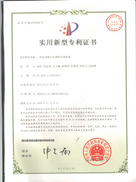 近日,由华夏学院研究发明的“一种氨基酸衍生物的合成设备”,顺利通过了国家知识产权局的审查并获颁实用新型专利证书(专利号ZL201520541764.1)。该项目由我院化学与制药工程系基础化学教研室汤军副教授负责,发明人还包括钱志强、汪大巍、操燕明、张慧贤、杜松云、刘嘉群,其中,刘嘉群为我院制药工程1133班学生。