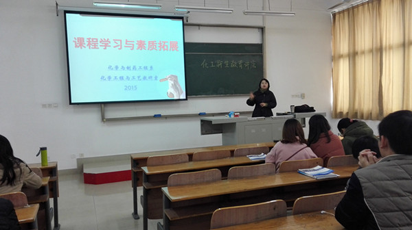 为了让15级大一新生对所学专业的课程设置、专业赛事及校园创新活动有比较清楚的认识,化学与制药工程系化学工程与工艺教研室,于12月11日上午10点在1-304教室举办了新生入学教育专业系列讲座之——课程学习与素质拓展,教研室曾洁、姬乔娜、赵蕾、王富老师及2015级化工专业全体学生参加了此次讲座。