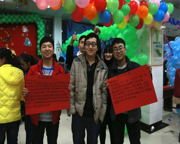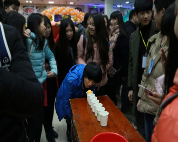 刚开始的游戏是“水上乒乓球、默契接球、智勇大冲关”,吸引了很多同学的参与,游戏的过程更是考验了同学们的默契度和反应能力,现场竞争十分激烈,场面热闹非凡。紧接着是“孤岛求生、吹牛逼、抽积木”,这些游戏人气爆棚,把活动推向了高潮。特别是“孤岛求生”,需要参赛者站在自己的岛屿上,通过划拳的方式保护自己的岛屿面积,输的一组要减少自己的岛屿面积,同学们都积极参与,努力的捍卫自己的岛屿,又想出各种方式站在岛屿上,争取存活到最后,让游戏的旁观者都为之称赞。此游戏不仅考验了参赛者的勇气和毅力,在游戏的过程也充满了欢声笑语。最后压轴的是“飞镖射气球、你比我猜”,其中“飞镖射气球”最受欢迎,参赛者需在三米之外的区域内射木板上大小不一的气球,一分钟内射到四个气球即为获胜,参赛者们争先恐后,尽情的享受游戏的带来的乐趣。伴随着新年的到来,在场的所有同学一起跨年,团学联的全体成员进行合影,活动进入了尾声。