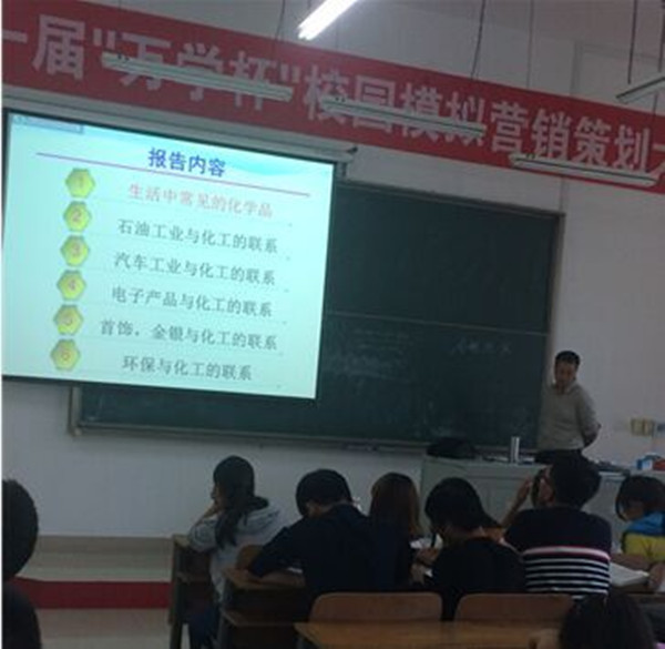王富老师以“你身边的化工”为题,给大家生动的介绍了化工技术在日常生活中各方面的应用。首先,王富老师进行了自我介绍,将自己在化工领域的学习、工作的画面展现在大家面前。然后,王富老师从“生活中常见的化学品”、“石油工业与化工的联系”、“汽车工业与化工的联系”、“电子产品与化工的联系”、“首饰、金银与化工的联系”、“环保与化工的联系”6个方面介绍了化工技术与生活的密切联系,让学生深刻感受到化工对人类生活的重要意义,以及学好化工的重要性。王富老师用精美的图片展示了化工产品在人们日常生活中衣、食、住、行各个方面的渗透。其中令人印象深刻的是,王富老师以当前社会热点——地沟油为案例,以风趣幽默的口气讲到地沟油的提炼技术也是化工技术,正当学生听的津津有味,笑声不断的时候,王富老师话锋一转,问学生:“如果4年后,你们步入工作岗位,在面对这样的诱惑你应该怎么做?”王富老师在给学生介绍专业知识应用的同时,还引导学生树立正确的人生观、价值观,让学生印象深刻。
