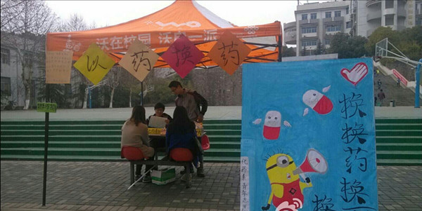 2015年3月16日,化学与制药工程系青年志愿者协会举办的的以“换换药,换换爱”为主题的以药换药的活动在华夏学院的一食堂对面操场上举行。