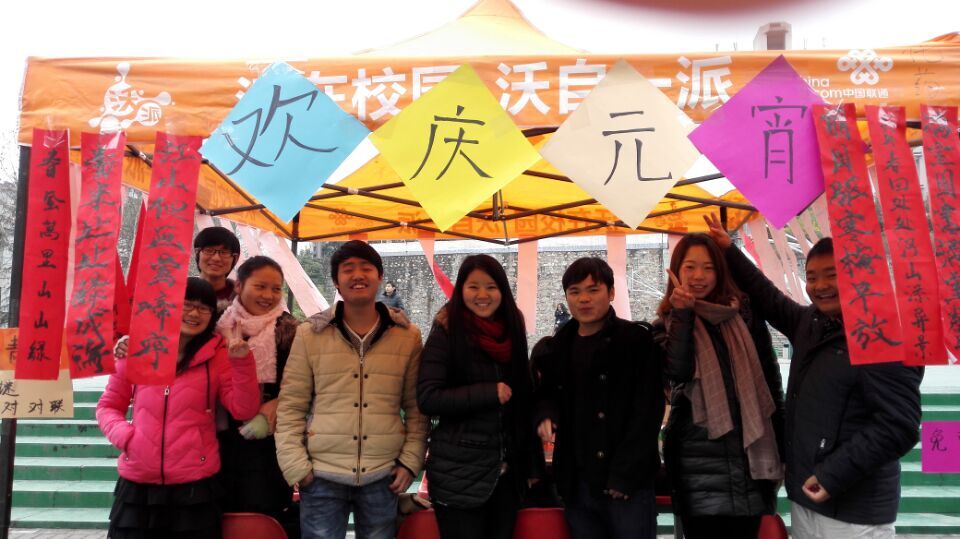 2015年3月5日 化药系青年志愿者协会在一食堂对面举行欢庆元宵活动,参与的同学可以猜灯谜、对对联,有兴趣的同学还能亲自书写下联贴在一起。