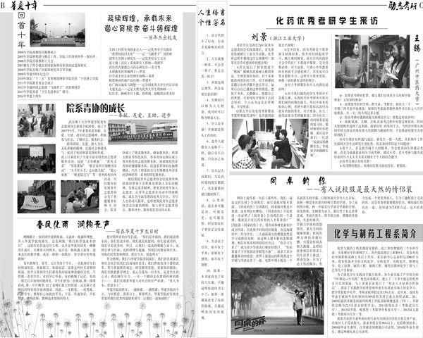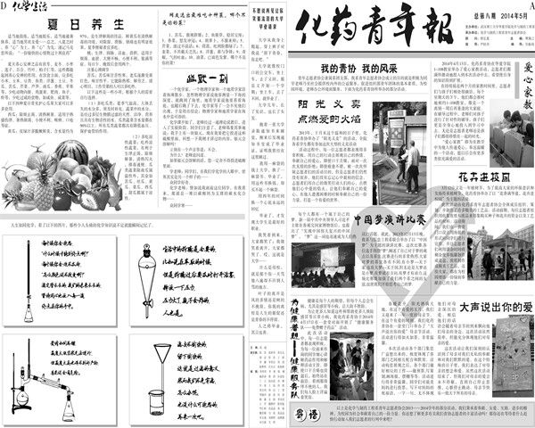 从开始系报的讨论交流规划到最后完美的呈现在大家面前经历了一系列的艰难过程,而每个部门的相互合作,每个助理的辛苦认真无一不为这个过程增添了一道道亮丽的风景。关于这次系报还是比较成功的,A版我的青协风采,B版华夏十年,C版励志考研,D版化学生活,内容精彩纷呈趣味十足。化学仪器与人生的完美结合和对化药考研通过学子的采访无一成为了这次系报的亮点,完美展现了化药的魅力。对人生的思考正如操作化学仪器般令人深思充满生活的哲理,在这能够参悟出不一样的人生哲理。