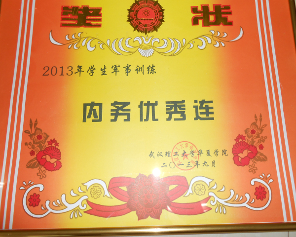 为鼓励同学们保持军训成果,弘扬军训生活中的优良品质,武汉理工大学华夏学院于9月25日上午在学术报告厅举行了2013年学生军训表彰大会。化学与制药工程系载誉而归:有11名同学荣获“军事优秀学员”、大一新生辅导员尹轻舟老师获得“优秀指导员”,同时我系大一新生连在2013年学生军事训练中也喜获“内务优秀连”,在这里对以上所获得奖项表示祝贺,谢谢你们为我系挣得了荣誉。