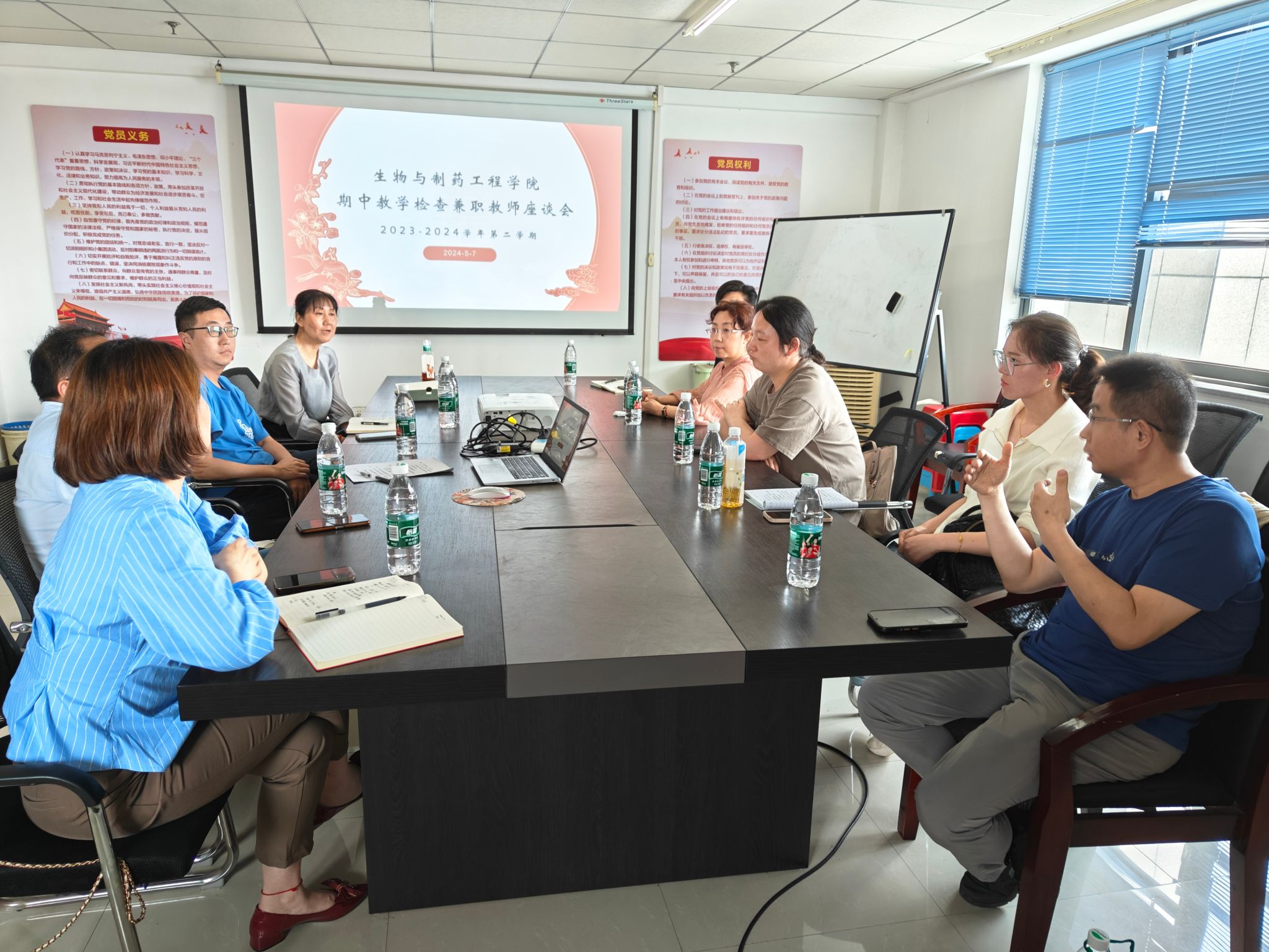 2024年5月7日中午,我院在综合楼1119会议室召开了期中教学检查兼职教师座谈会。4名兼职教师,教务部副部长项金辉、院长程弘夏、各系主任、实验中心主任、教学行政办主任和学生办公室主任参加了会议。