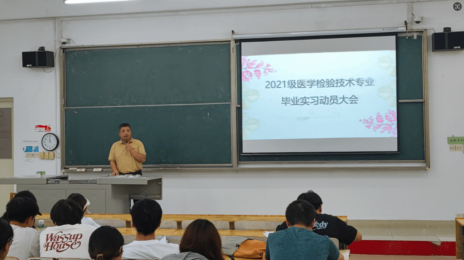 为了扎实做好2021级医学检验技术专业毕业实习工作,进一步促进学生对所学知识和技能的实践运用、总结和深化,引导学生明确认识实习的目的和意义。6月13日下午,生物与制药工程学院2021级医学检验技术专业毕业实习就业动员大会在教学楼3-101室召开。学院党总支书记余朝阳,医学检验技术系主任杨艾玲、教学行政办杨丹,各实习带队教师以及2021级医学检验技术专业全体学生参加了此次会议。会议由2021级医检专业辅导员李博祎主持。