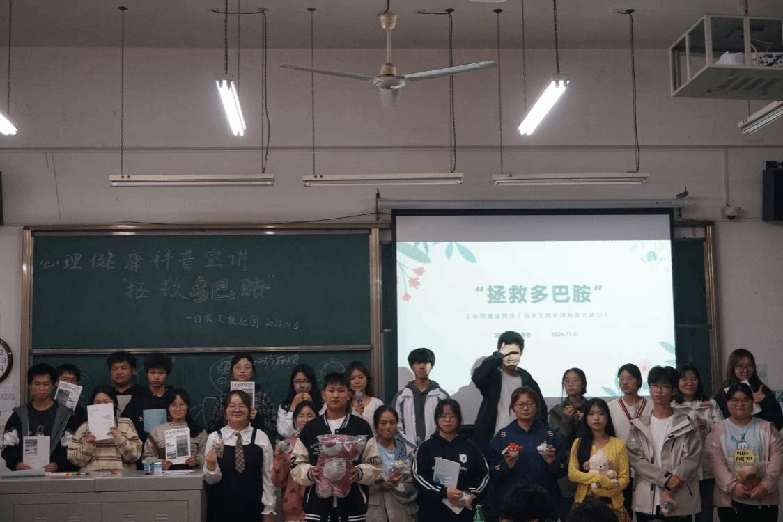 2024年11月6日,在生物与制药工程学院团总支指导下,白衣天使社团1教101举办了主题为“拯救多巴胺”的心理健康科普宣讲会。本次宣讲会旨在促进大学生的心理健康,通过对心理健康疾病的深入剖析,引导大学生关注、理解及正视心理健康疾病。活动邀请到了生物与制药工程学院团总支书记林珑老师出席参加。