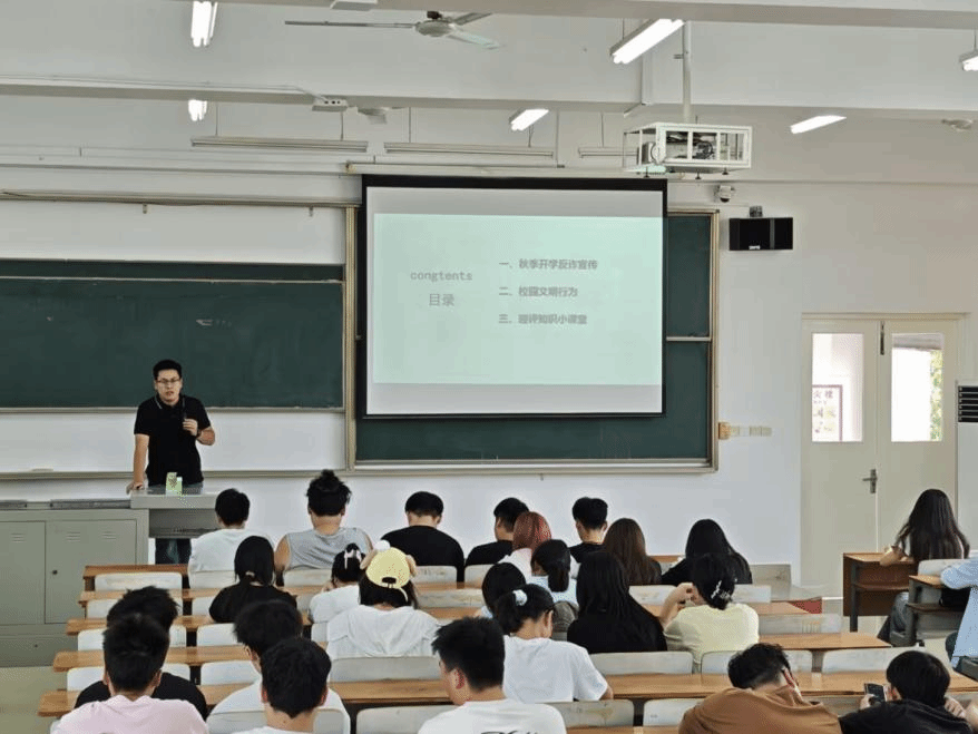 班会上,李博祎结合当前网络安全形势和高校特点,通过剖析典型网络安全案例,从网络安全法律法规、个人信息保护、电信诈骗防范、网络文明素养等多个方面进行了深入浅出的讲解。