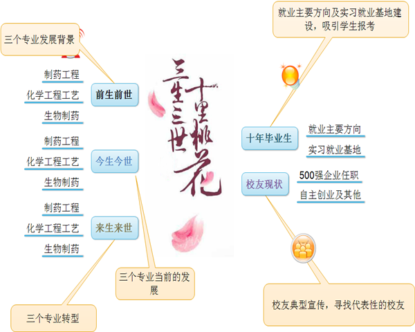 各系、实验中心、教学行政办、学工办根据3月28日上午各部门负责人讨论会讨论通过的“关于拍摄生物与制药工程学院“三生三世十里桃花”纪录片的思维导图”(如图1所示)撰写脚本、汇集材料,脚本按《纪录片脚本》模板撰写,材料按J001、J002、J003……顺序存放在相应的文件夹里,并在纪录片脚本对应位置标注。