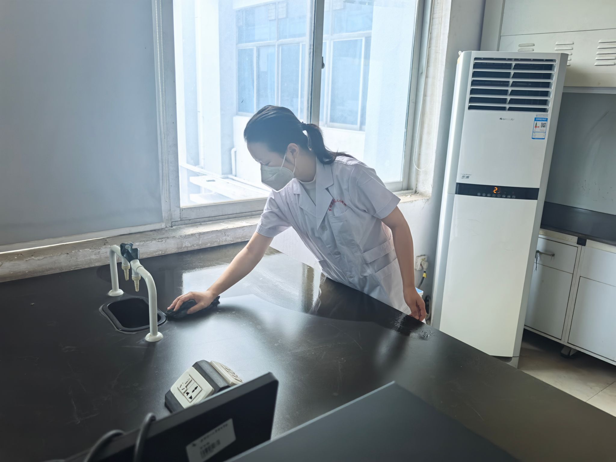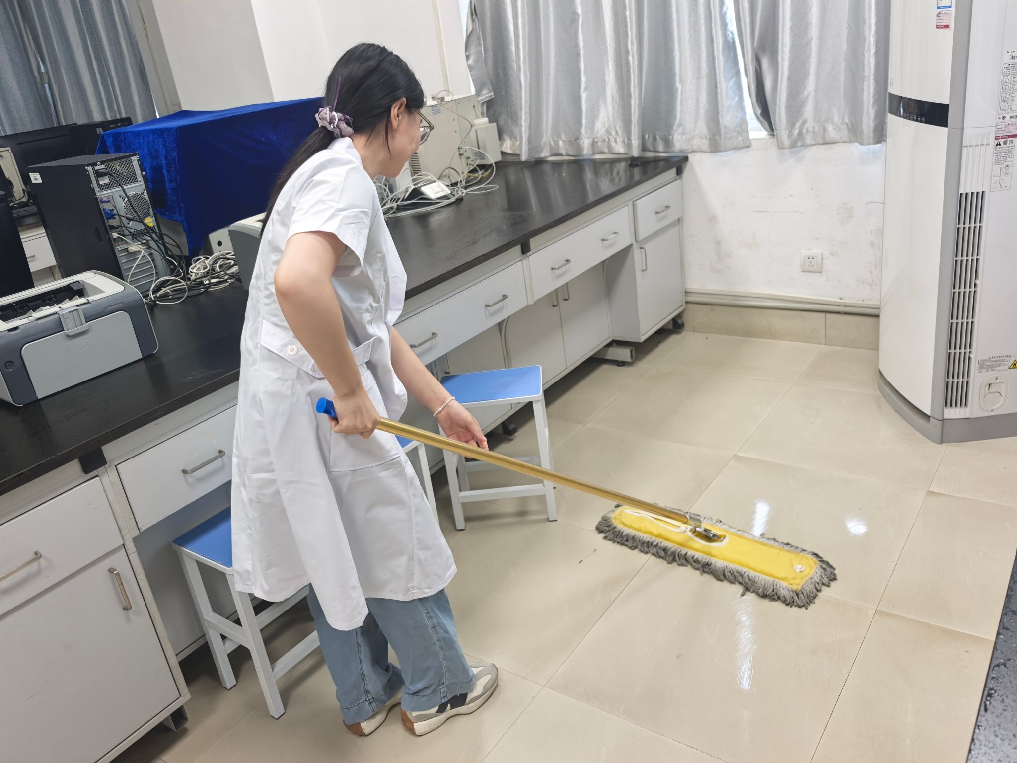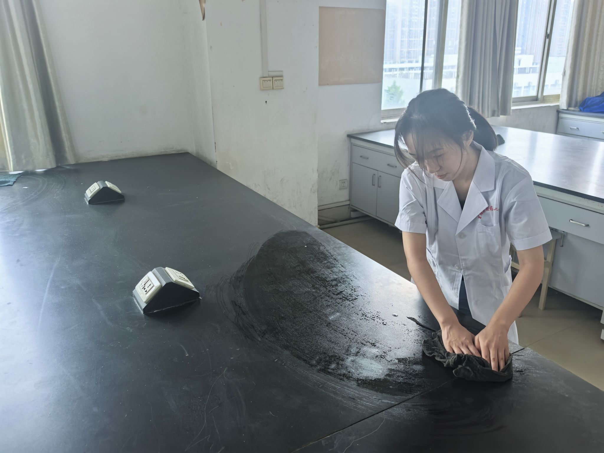 活动当天,尽管天气炎热,但老师们热情高涨。他们暂时放下粉笔和教案,拿起抹布、拖把、仪器清洁工具,深入各个实验室、准备间和仪器室。从擦拭实验台面、通风橱、玻璃器皿,到清洁精密仪器设备,老师们分工明确,配合默契,不放过任何一个卫生死角。老师们一边仔细擦拭台面,一边梳理课程内容,他们说实验室是科学探索和实践的重要场所,它的洁净与安全直接关系到教学质量和同学们的安全。我们亲手打扫,既是对学生负责,也能在新学期伊始,‘净’候学子归来,给他们一个最好的实验‘第一课’。”
