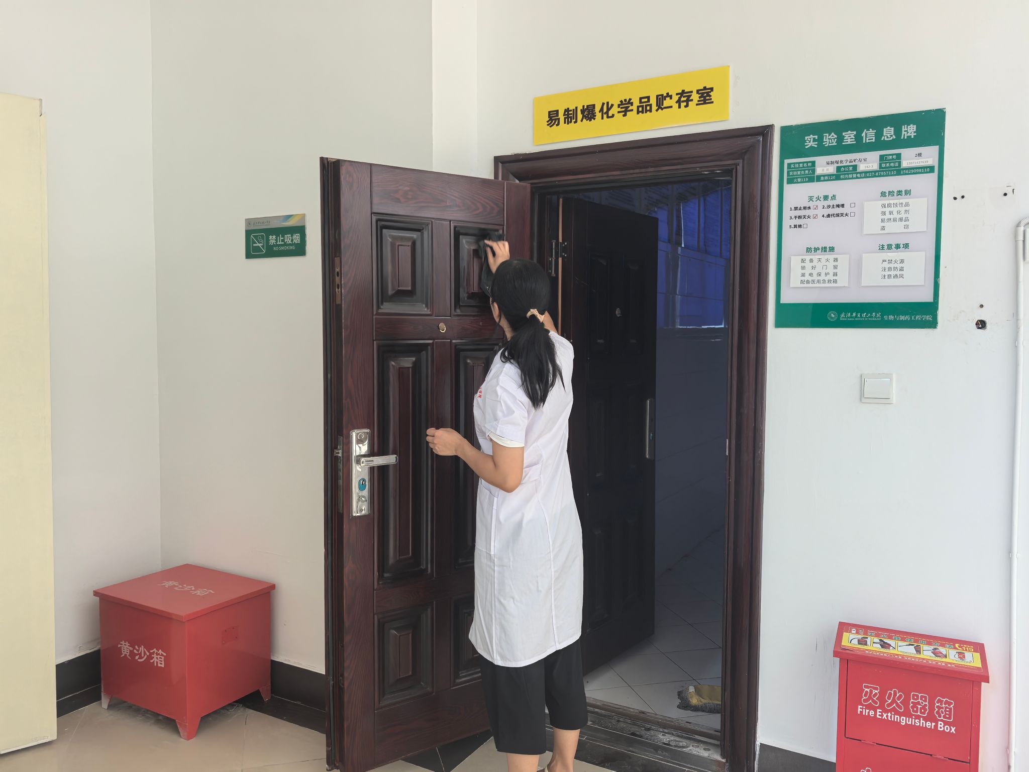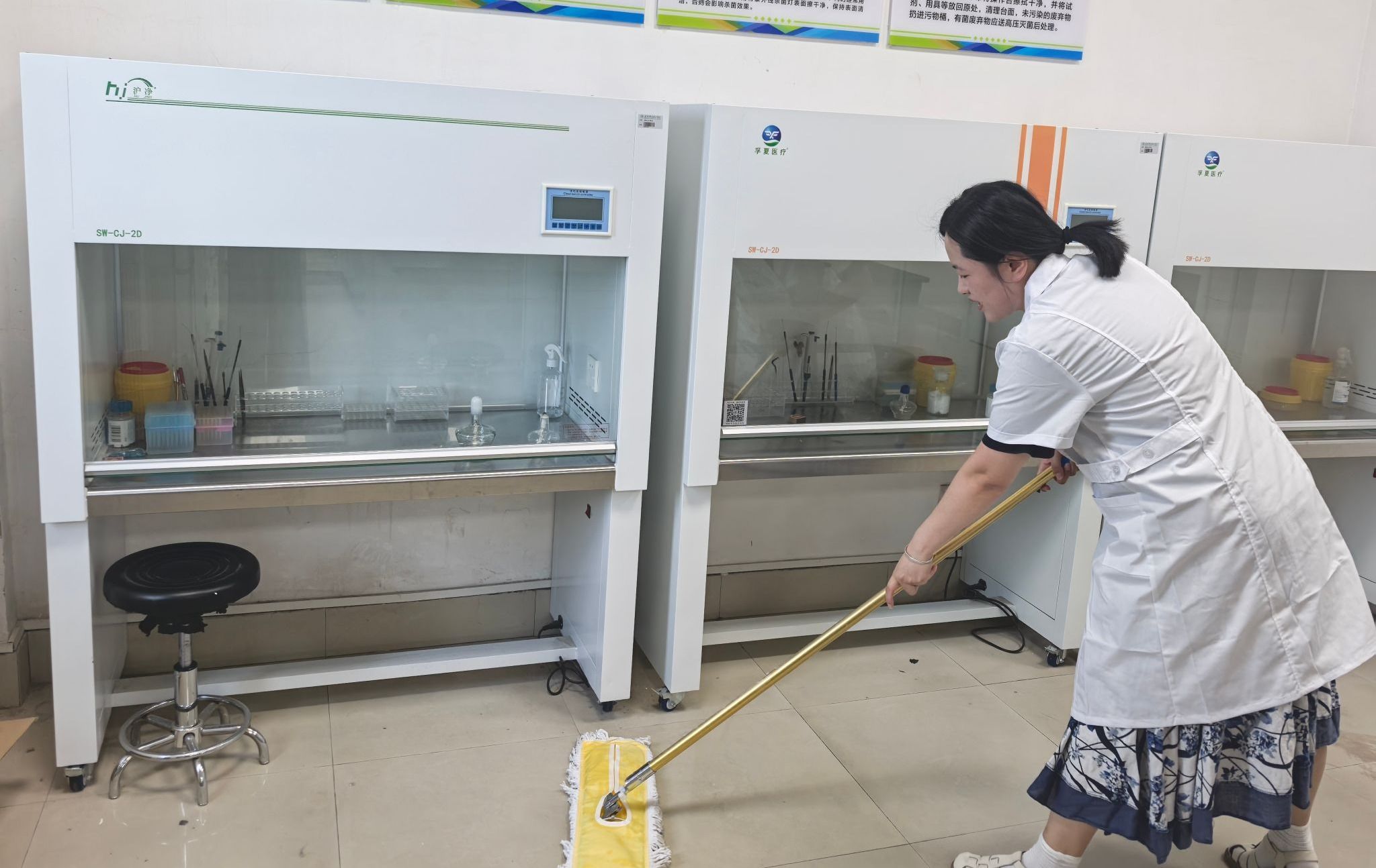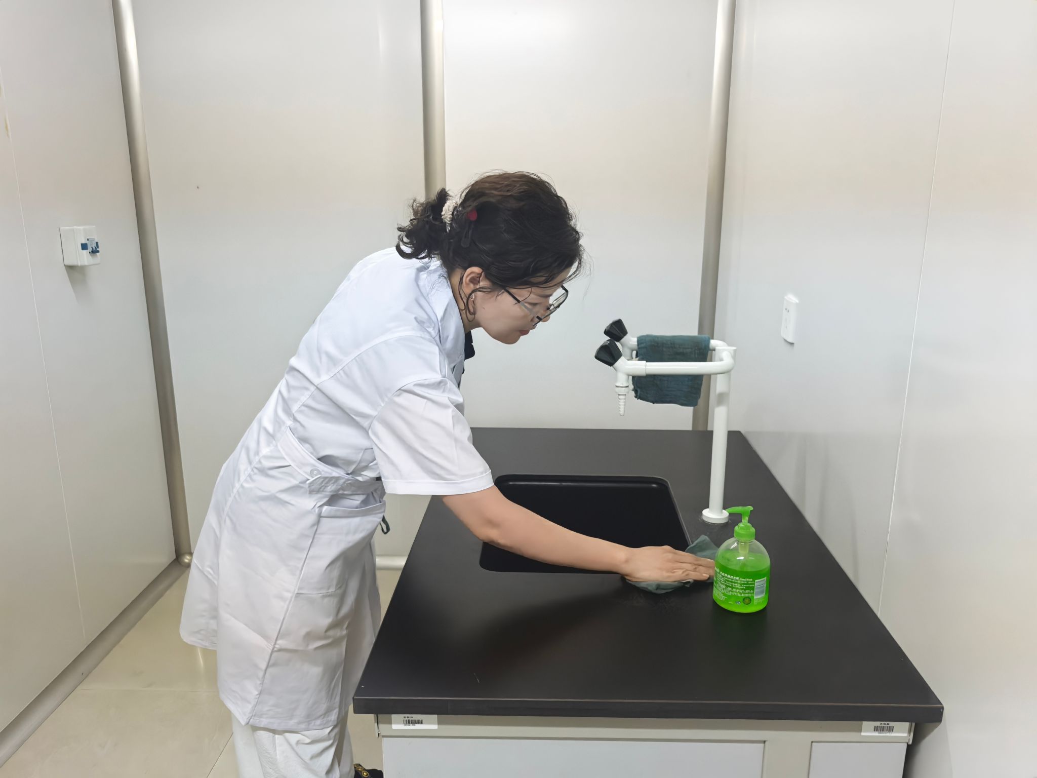 活动当天,尽管天气炎热,但老师们热情高涨。他们暂时放下粉笔和教案,拿起抹布、拖把、仪器清洁工具,深入各个实验室、准备间和仪器室。从擦拭实验台面、通风橱、玻璃器皿,到清洁精密仪器设备,老师们分工明确,配合默契,不放过任何一个卫生死角。老师们一边仔细擦拭台面,一边梳理课程内容,他们说实验室是科学探索和实践的重要场所,它的洁净与安全直接关系到教学质量和同学们的安全。我们亲手打扫,既是对学生负责,也能在新学期伊始,‘净’候学子归来,给他们一个最好的实验‘第一课’。”