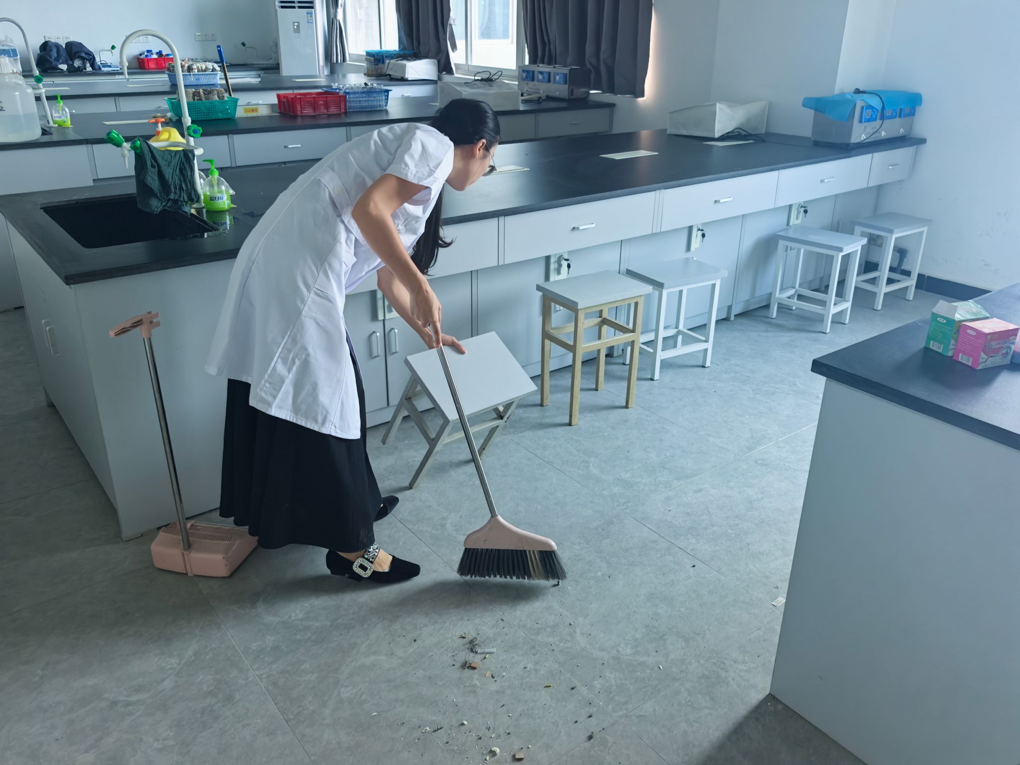 老师们忙着擦拭仪器,他们说这不仅是打扫,更是一次对实验设备和材料的全面梳理,有助于我们更好地规划新学期的实验课程。经过数小时的辛勤劳动,实验教室面貌焕然一新,窗明几净,仪器设备摆放井然有序,实验台面光洁如初,为即将开始的实验课程做好了万全准备。阳光透过干净的窗户洒进实验室,仿佛也预示着新学期充满希望与活力的开始。