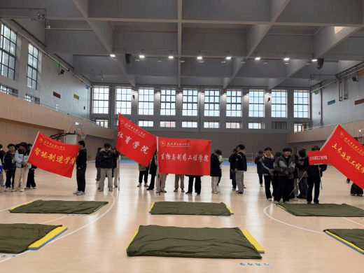 比赛尚未开始,体育馆内早已是座无虚席,人声鼎沸的浪潮里,藏着观众对这场赛事的满心期待。生物与制药工程学院的队伍尤为亮眼,同学们高举学院旗帜,尽显昂扬风貌。辅导员陈昌翠站在选手身旁,不时为大家加油打气,让参赛学子倍感振奋。