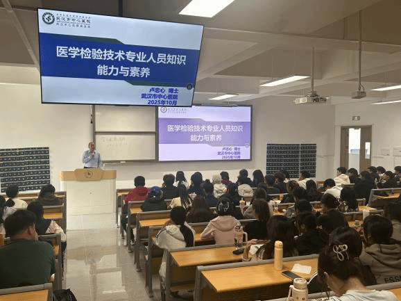 9月14日下午,武汉市中心医院检验科卢忠心教授应邀来到我校梧桐湖新校区,为生物与制药工程学院医学检验技术专业2025级新生带来了一场精彩的《医学检验导论》课程。这已是卢教授连续第六年在新生入学之际,为医学检验学子讲授专业启蒙的第一课。