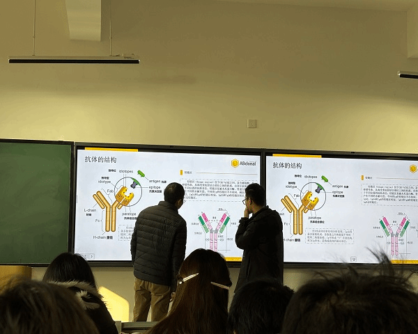 课堂上,企业专家以单克隆抗体药物为核心,系统梳理了其从概念提出到技术突破、再到成为现代生物医药支柱之一的辉煌发展历程。从早期的杂交瘤技术,到如今的重组DNA、噬菌体展示及转基因动物等关键技术演进,讲解清晰勾勒出这一领域科学探索与工程实践的壮阔图景。理论离不开实践的支撑。专家重点结合武汉爱博泰克公司在单克隆抗体研发方面的具体案例与实践经验,向同学们深入浅出地剖析了抗体药物的完整研发工艺链。内容涵盖靶点筛选与验证、抗体人源化与亲和力成熟、细胞株开发与培养工艺、纯化策略、质量分析与控制,以及临床前与临床试验的关键环节。通过真实的企业研发视角和流程展示,抽象的书本知识转化为生动可感的产业现实,使学生对“研发一款创新生物药究竟需要经历什么”有了更为直观和深刻的理解。