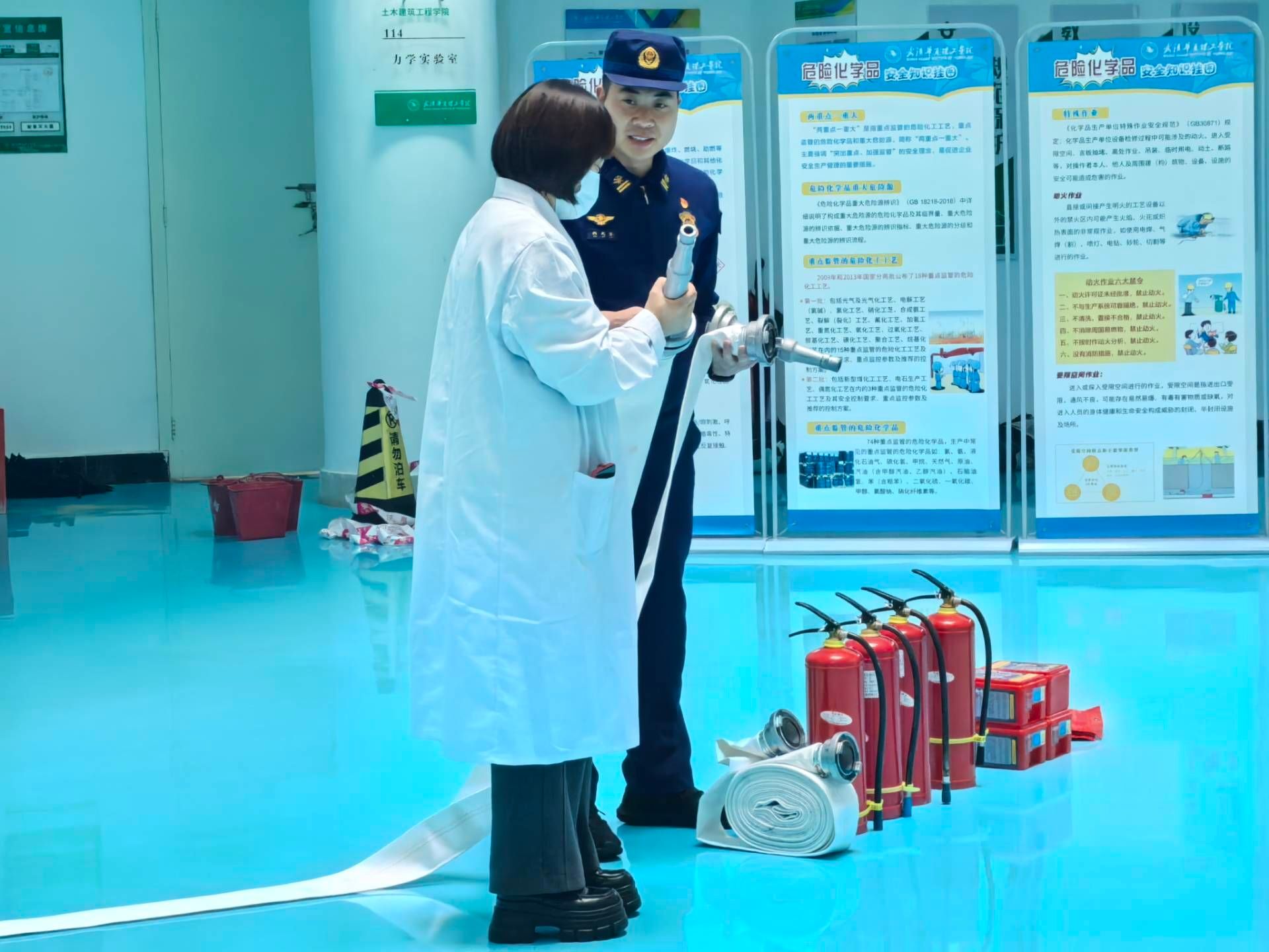 演练于当日14时30分正式启动,东湖高新消防救援站的专业人员应邀到场,为师生系统讲解了消防水带、灭火器、防烟面罩、灭火毯等常见消防器材的使用方法,并邀请部分师生进行实际操作体验,切实增强了大家应对危险化学品及危险废物泄漏事故的实战能力。演练现场模拟了实验室突发危险废物泄漏的紧急场景。面对模拟险情,参演师生迅速响应,严格按照应急预案流程,有序开展现场封锁、放置围堵沙袋、铺撒沙子、铲沙覆盖等一系列应急处置工作。整场演练组织周密、指挥得当,各环节衔接紧密,达到了预期效果。随后,东湖高新消防队现场演示了由无水乙醇易燃物泼洒引发火灾的险情处置,示范了灭火毯覆盖灭火等应对策略。本次演练现场,全体师生均能听从指挥、主动避让,展现出良好的安全素养与秩序意识。