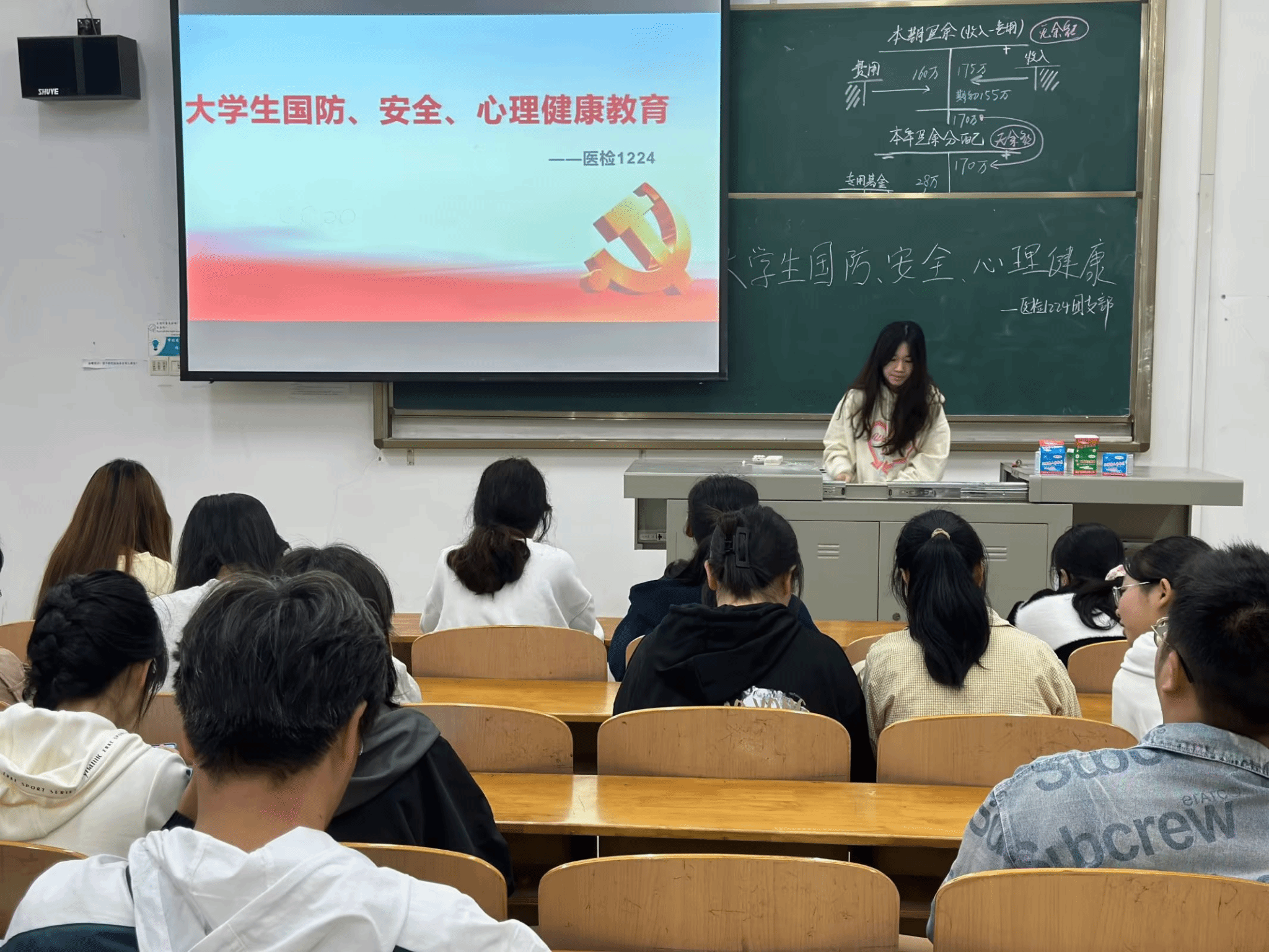 坚持国防教育与学生的日常养成相结合,学校可以通过参照中国人民解放军的条令条例,起码在军训阶段,落实准军事化管理制度。医检1224班于10月9日在2-104开展观看学习“大学生国防、安全、心理健康”班会。