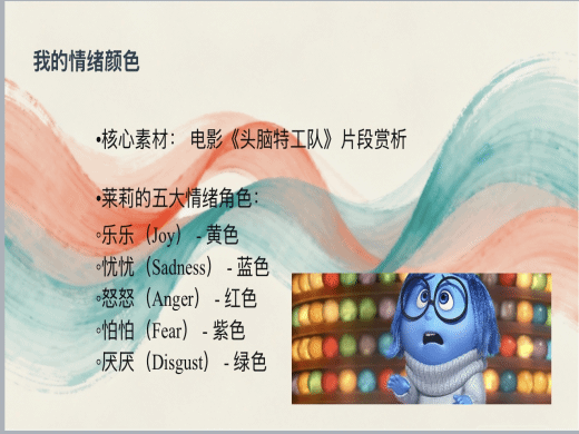 课堂中段,吴碧凯老师播放了动画电影《头脑特工队2》中的经典片段——莱莉的大脑里,“焦虑”情绪小人从最初的混乱主导,一直为莱莉的未来打算,让莱莉产生巨大压力,但经过其他情绪小人的协作,最终帮助莱莉接纳复杂情绪、建立心理平衡。吴老师结合片段解读:“我们每个人的情绪都是多元化的,负面情绪并非洪水猛兽,而是我们了解自己的窗口。”当焦虑来袭,允许情绪流动,让不同情绪找到合理的出口。