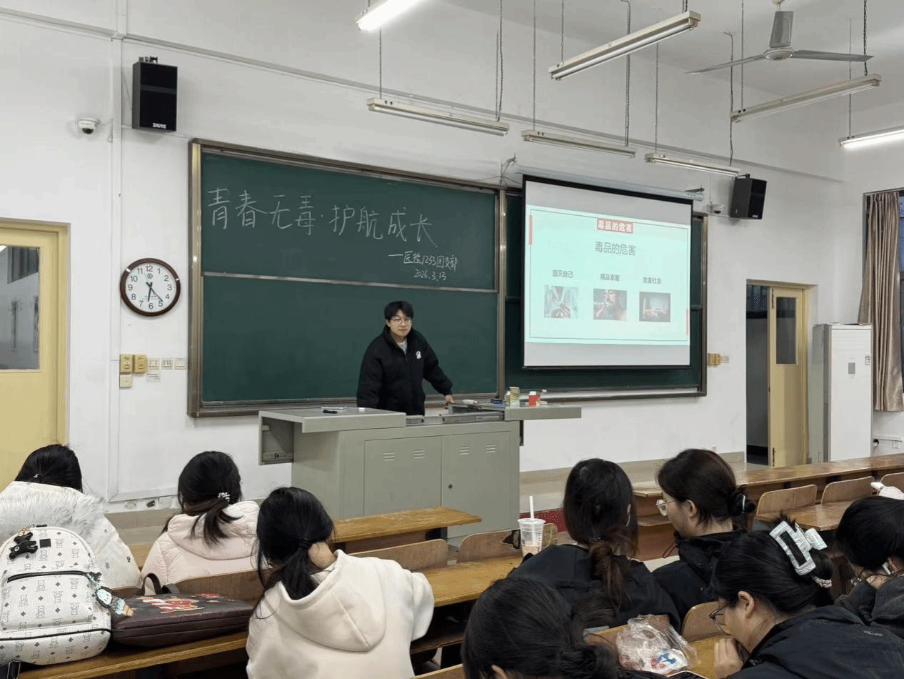 活动中,邓小雨围绕禁毒法律法规、毒品类型与危害、新型伪装毒品识别、校园防范技巧等内容开展讲解。他结合医学检验专业特点,从生理健康、成瘾机制与职业底线视角,系统讲解了毒品对个人、家庭与社会的严重危害,重点警示“奶茶、跳跳糖、电子烟、减肥糖”等伪装毒品陷阱,提醒同学们警惕好奇心理、谨慎交友、拒绝来源不明物品。随后,全体同学共同观看禁毒警示教育片,通过真实案例深刻感受毒品带来的毁灭性后果,进一步强化法治观念与风险意识。