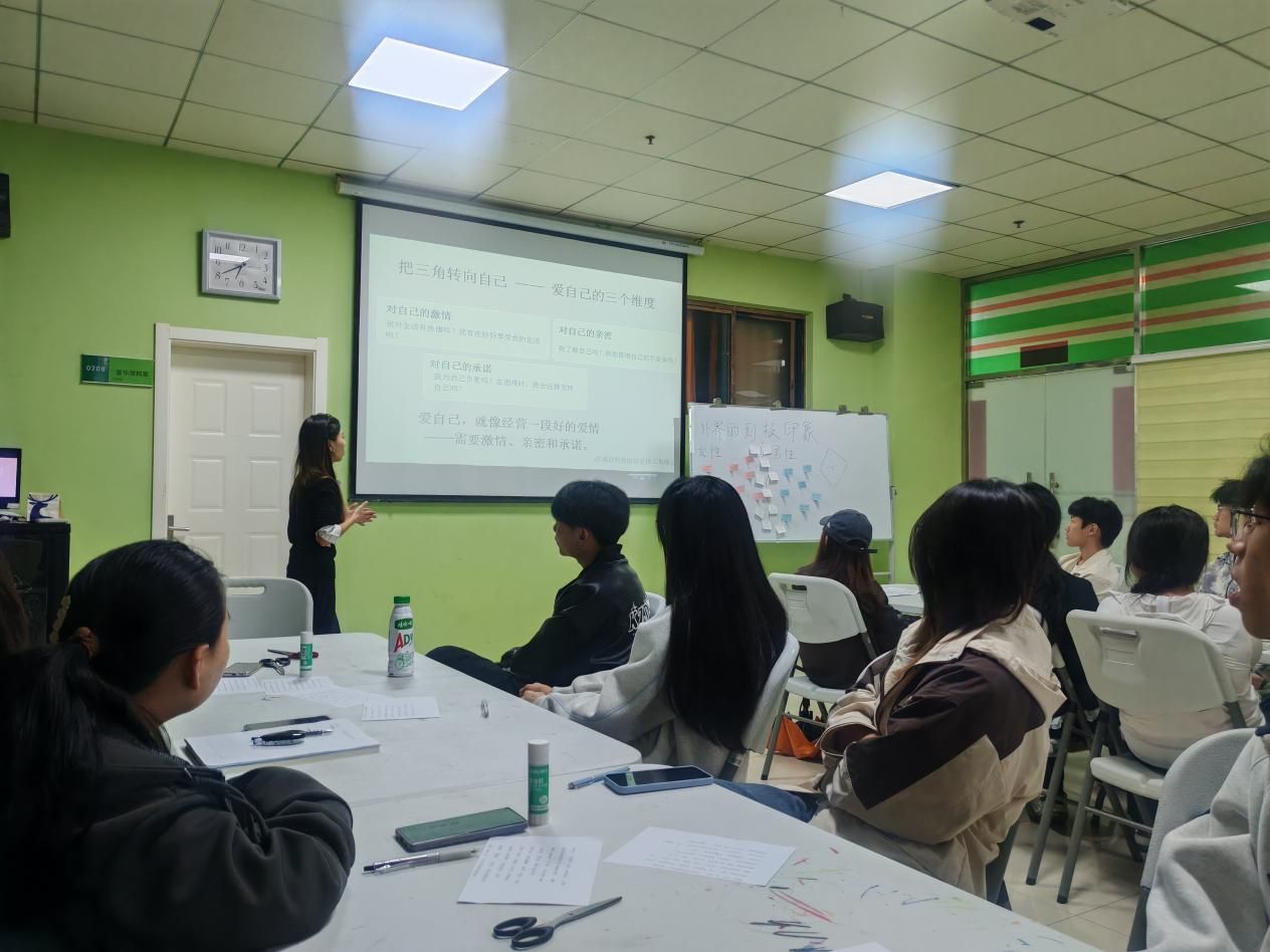 随后,讲座进入创意互动环节。老师为大家提供了包含情感、成长、边界、尊重等内涵的词语与短句,让同学们自由组合,拼写出属于自己的青春小诗。大家认真思考、积极创作,用文字表达对自我、情感与人际关系的理解。在分享环节,不少同学朗读了自己的作品,既展现了青春思考,也传递了健康积极的价值观。