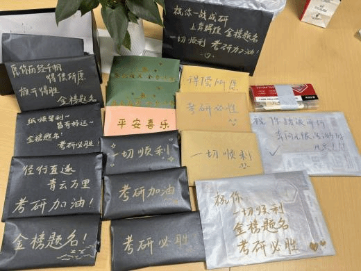 活动现场,志愿者们精心准备了暖宝宝、手写祝福贺卡与考试文具礼包。暖宝宝为寒冬里埋头苦读的考研人带来切实的温暖;中性笔、2B铅笔、橡皮等考试文具为备考提供了实用物资支持;而一张张写满真挚祝福的贺卡更是满载心意,“金榜题名”“考研顺利”等真挚祝福跃然纸上,字里行间体现了对学长学姐的美好期许。志愿者们将礼包逐一送到考研学子手中,用亲切的话语为他们加油鼓劲,让备考的学子们感受到关怀与情谊。