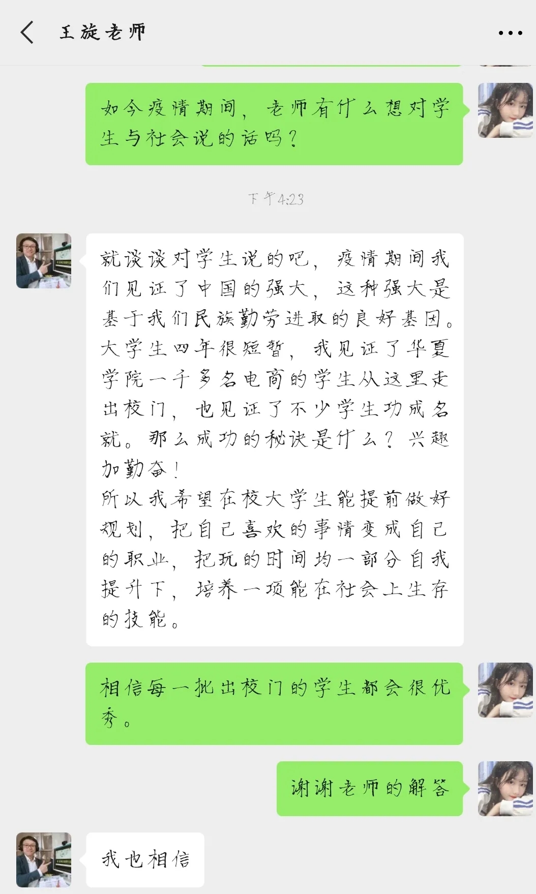 记者与王旋老师的对话(中国青年网通讯员 戴梦娜提供)