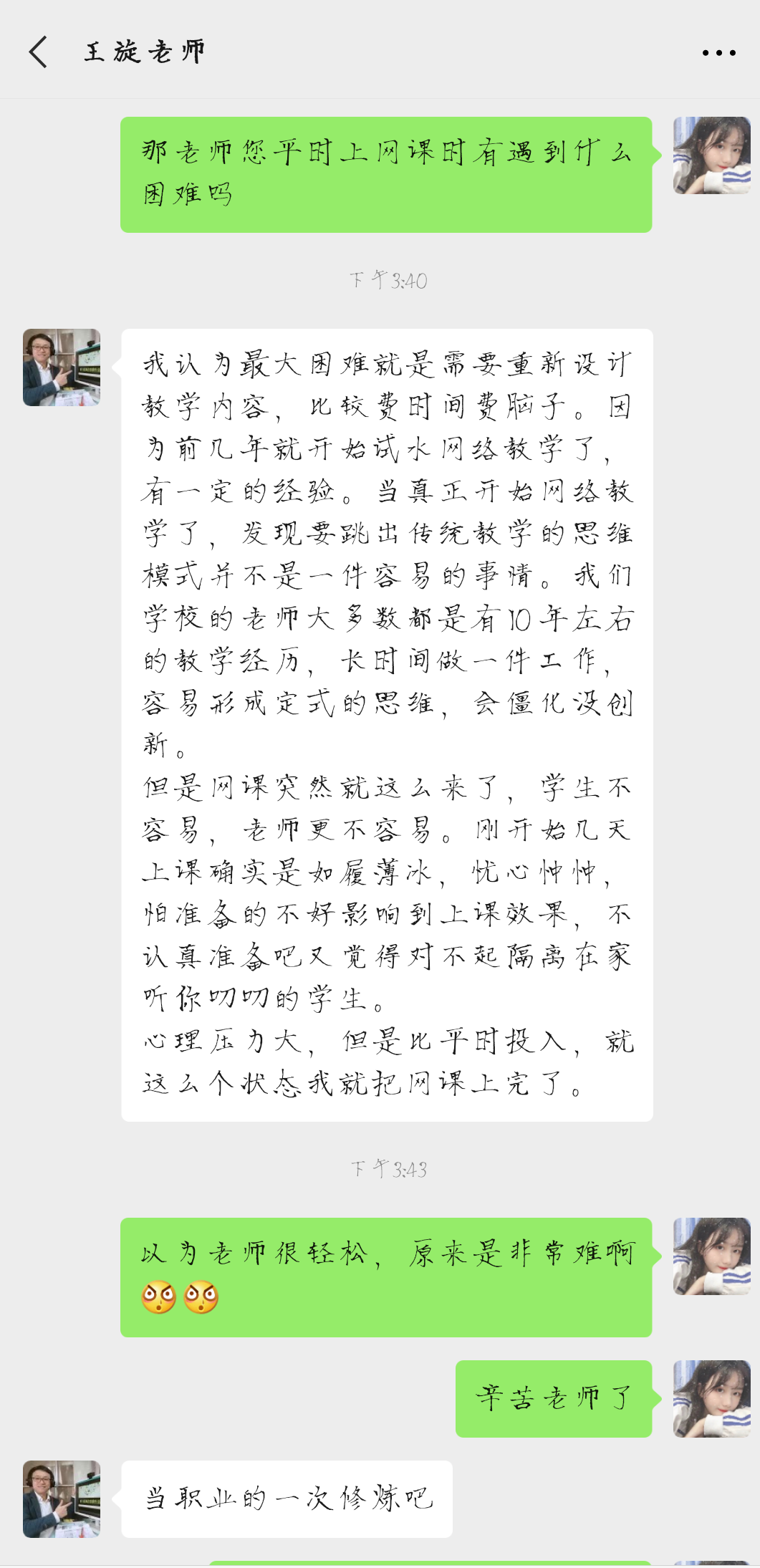 在采访的过程中,可以了解到王旋老师是一位认真负责、照顾学生状态的老师。在线上教学期间,他对自己的课程进行了科学的设计,并且重新编排了教学内容来适应全新的教学模式——“云教学”,以此来保证学生的学习质量。而在采访中和王旋老师主要以“对于疫情期间的云教学有哪些看法和建议”为话题展开交流。在与王旋老师近一个小时的交流过程中可以看出,相比传统教学,王旋老师比较倾向于这种 “云教学”模式。王旋老师认为这种 “云教学”模式极有可能成为未来教学的一种趋势,这种教育模式能够更好地发挥学生的学习主动性,加深对所学知识的深入理解;培养学生的自学能力和提出问题的能力,也能在一定程度上对学生进行个性化培养。但是面对这种教育模式时,老师们需要主动去适应其变化。或许这种“云教学”模式对于有多年教学经验的老师来说,实施起来可能会遇到很多困难和不适应的地方,但正如王旋老师所说:“有价值的知识应该经受得起网课的考验”。不仅如此,每位同学们也要主动适应新的学习方式,“云教学”虽然新颖,但是相对课堂教学少了许多“约束”,在家上课,许多同学会降低学习要求变得懈怠。所以每位同学要增强自制力,约束自己,云课堂也要“好好学习,天天向上。”做到停课不停学。