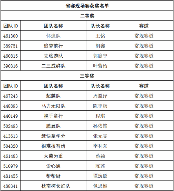 在经过现场的激烈比拼后,我校学子成功杀出重围,夺得省赛二等奖4名,三等奖10名。其中二等奖队伍为二三成群队、怀遗队、追梦前行队、去旅游队,三等奖队伍有超越队、马力无限队、携手童行、腾翼队、赶快拿学分队、很难拔智齿队、大菊为重队、爱心通队、帮帮厨队。比赛结果公布后,本次三创赛省赛也落下帷幕,在我校学子的不懈努力拼搏下,成功为我校再添几分荣誉,为自己的青春再添一分色彩。