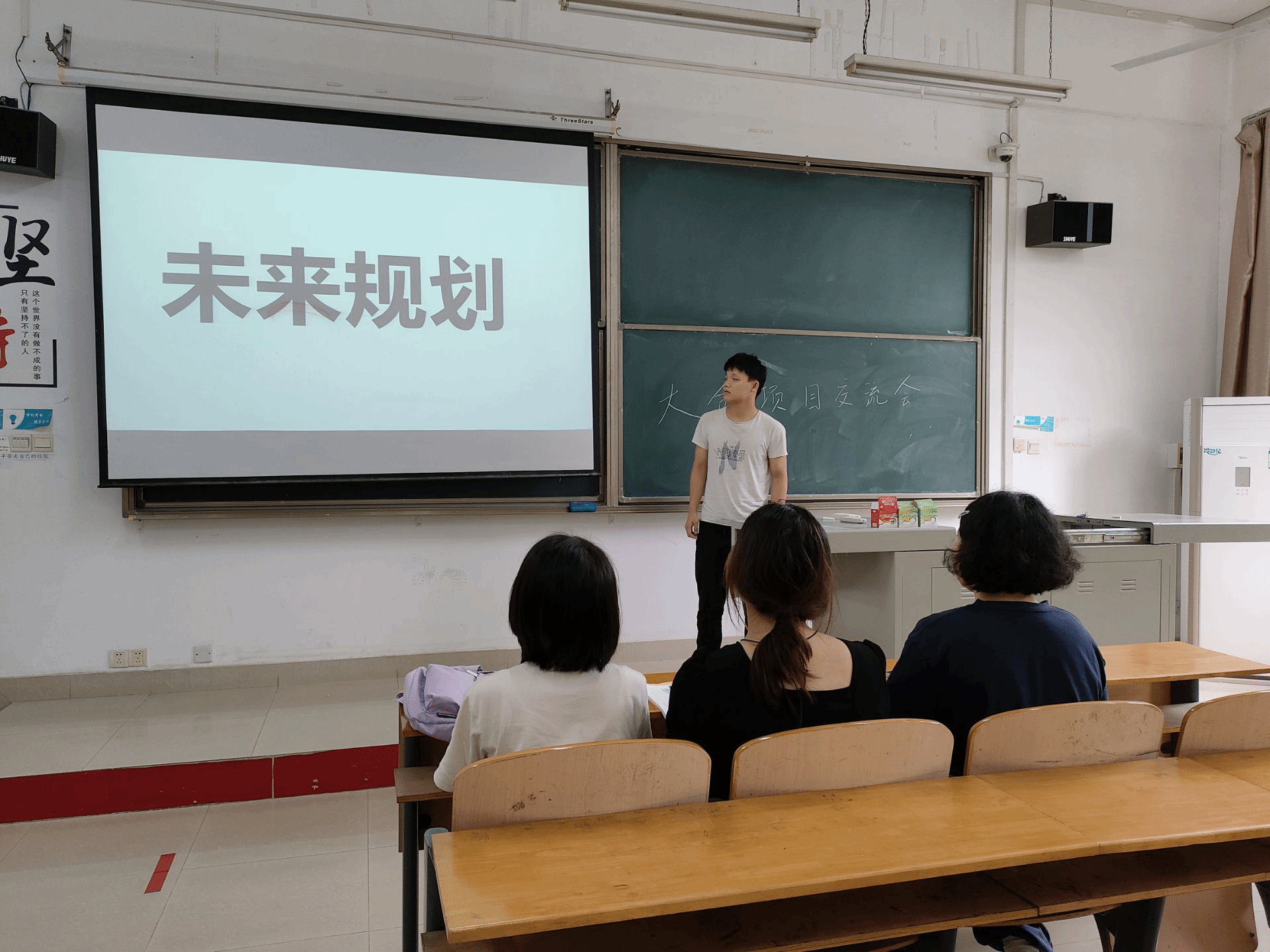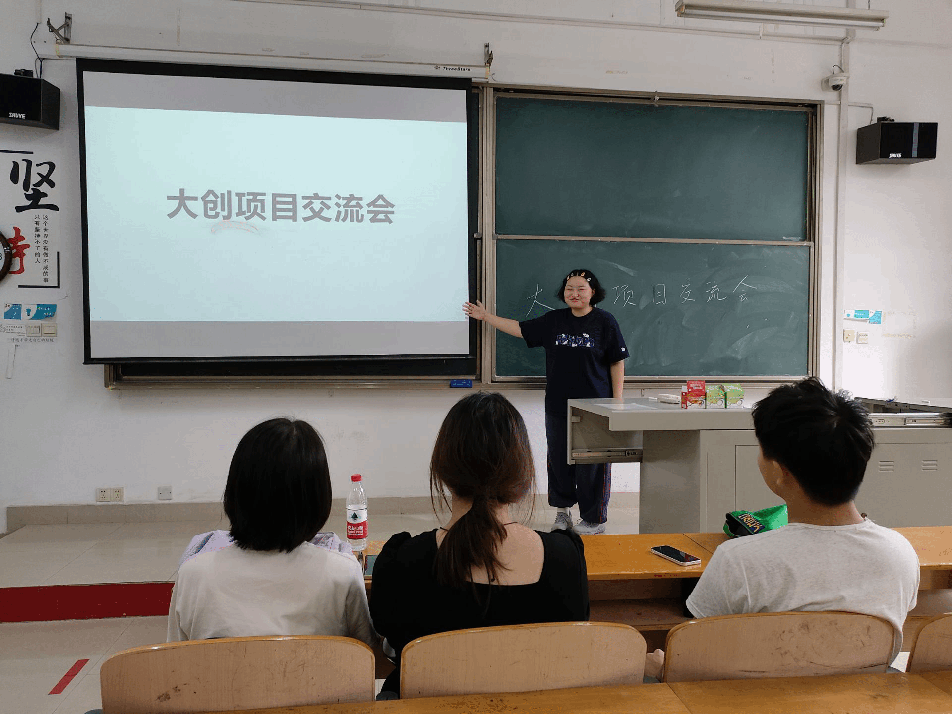会议第一项,董苏情同学向团队成员展现了他们的项目成果,同时也分享了一些关于创新创业项目的经验。
