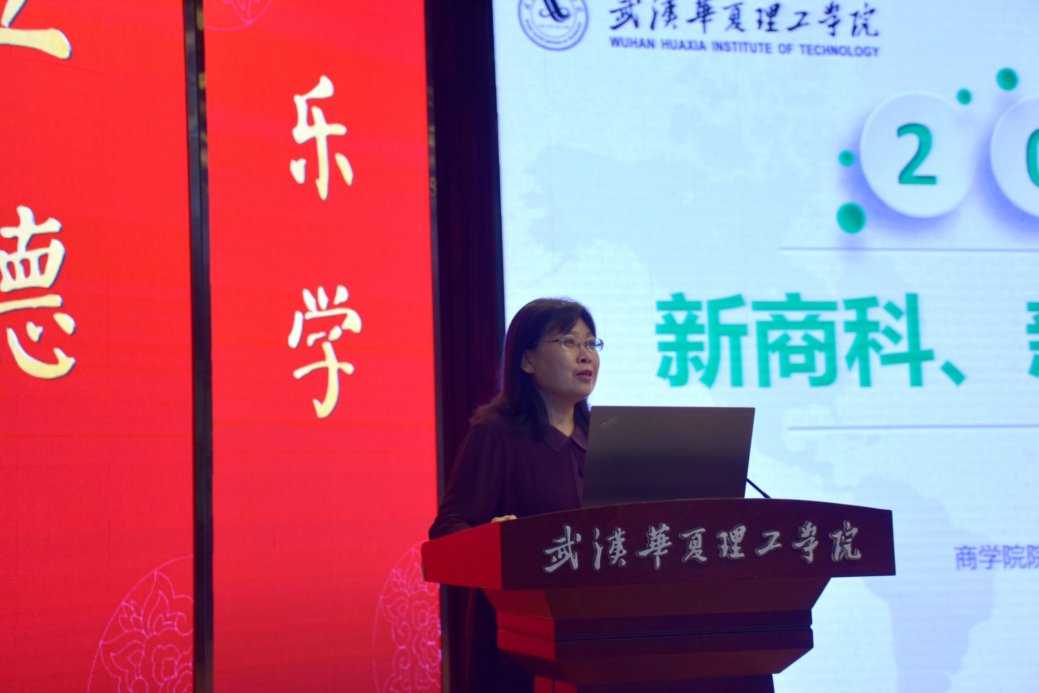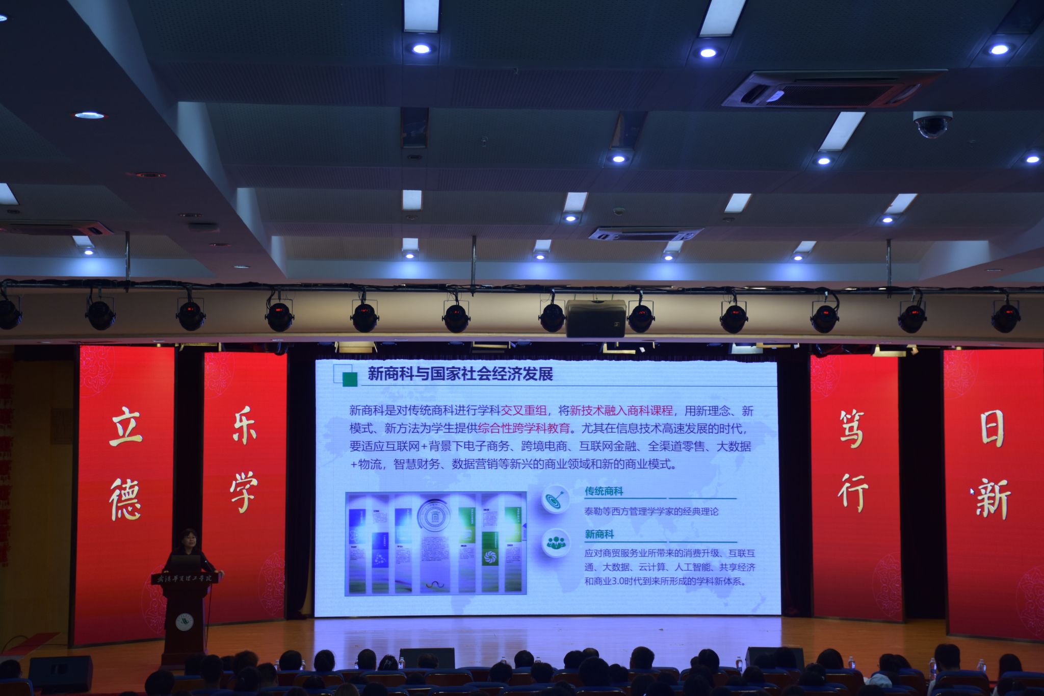 院长程艳霞以“新商科、新思维、新起点”为主题,分别从新商科与国家社会经济发展、新商科人才需求与发展前景、华夏新商科人才培养的战略举措三个方面详细介绍了新时代背景下,商科专业的变化与发展,展示了华夏商学院在建设新商科上取得的成果以及在人才培养方案上的创新。程院长强调,在信息技术高速发展的时代,学科建设与发展要适应互联网+背景下电子商务、跨境电商、互联网金融、全渠道零售、大数据+物流,智慧财务、数据营销等新兴的商业领域和新的商业模式。对与同学们存在的疑虑,程院长指出新商科就业前景好,成长空间大,在就业市场上横向竞争力较强,呼吁各位同学要积极投身专业学习和社会实践,在学校的政策驱动下,充分利用学院提供的优质资源,不断提升自我,发展能力,拓宽视野,逐步成为全方位的高素质人才,为学科建设以及社会发展贡献青春力量。