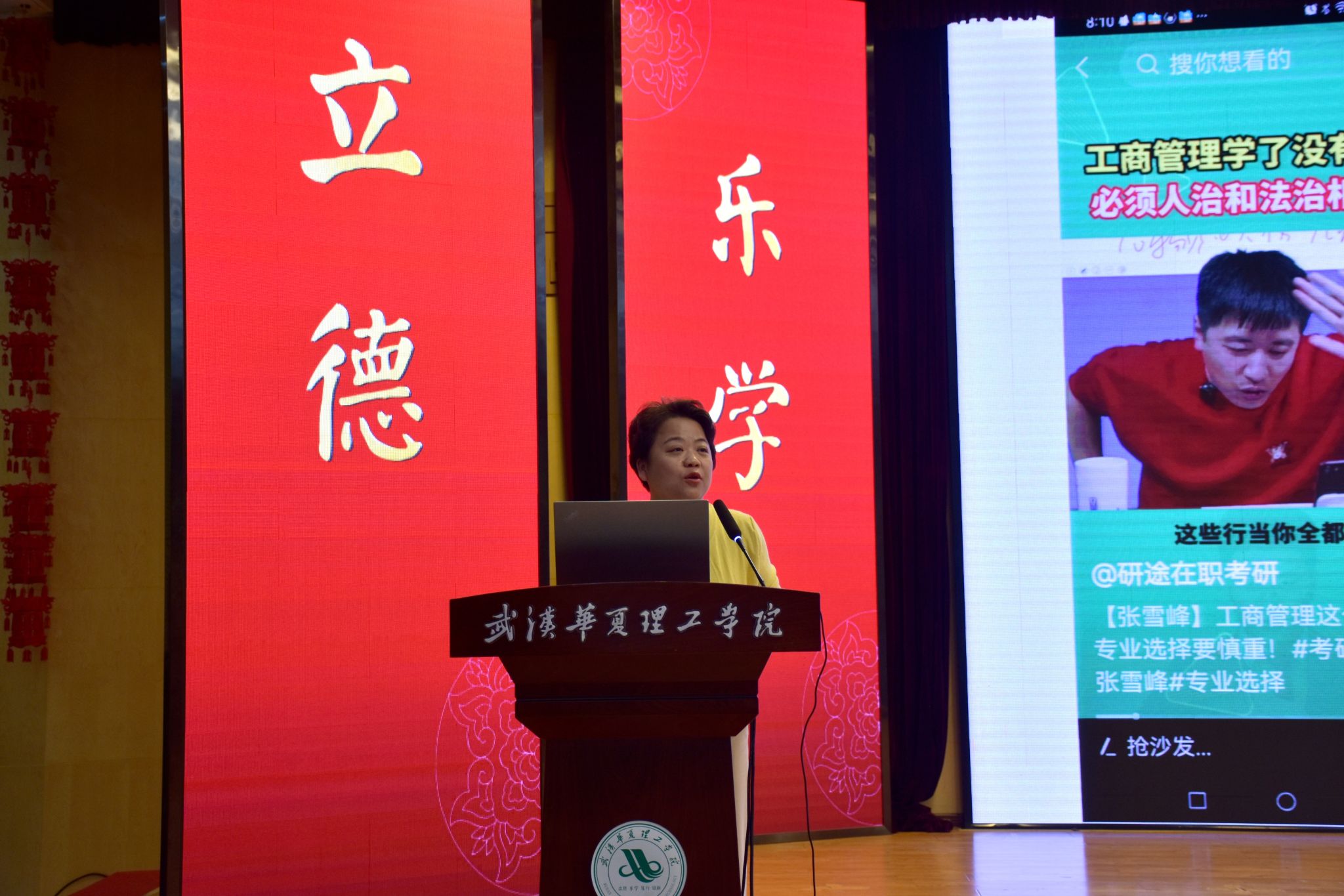 商学院副院长王艳教授以张雪峰的考研指导视频以及热点新闻事件为楔子,引出当下工商管理(新媒体运营方向)和物流管理(供应链管理方向)在面对此类社会现象时,应该如何反思与发展。同时她强调,同学们要打破惯性思维和歧视思想。对于专业性质及其内涵,要有清晰的认知,不能人云亦云。