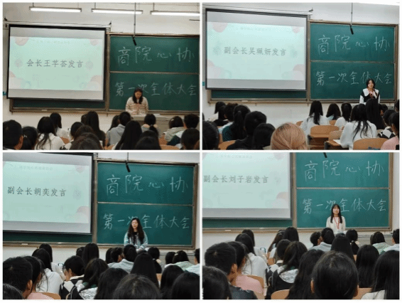 在纪燕灵老师发言之后,商学院心理健康协会会长和部长们依次对新干事们表达了对未来工作的期望和希望大家共同进步,有所成就。在这之中,会长王芊荟为新干事们讲述了心协的主要工作和服务对象,向新生展示了心协过去获得的各种荣誉。王芊荟会长希望新干事们不仅仅可以延续这些荣誉,在之后也能达到更高的成就。