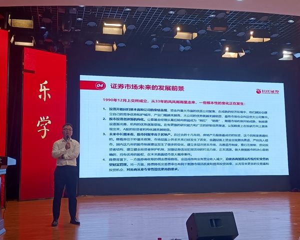 长江证券财富管理中心投教专员中国投资者网国民金融教育讲师王凯在“证券行业职业发展路径”这个主题上作了讲解。他主要在证券业发展状况、其职业发展途径、行业介绍等方面展开,也向同学们说明了该行业的要求及需努力的方向。