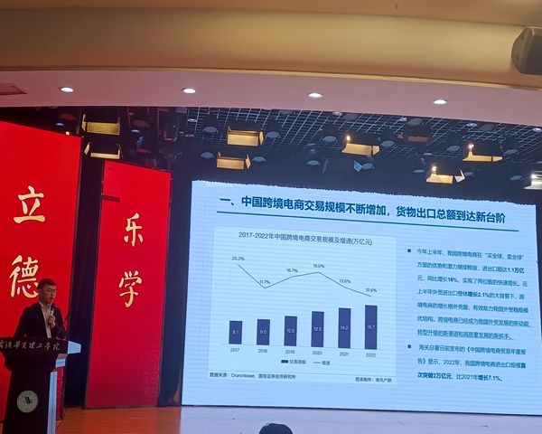 湖北自贸区意尚国际供应链股份有限公司总经理明廷栋,他对“AI 赋能跨境电商”这一主题作了详细解说。他分别从跨境电商在中国的特征、其就业形势、电商市场的延伸与扩张等方面说明,尤其说明了AI在市场上的作用与优势,在场的同学也因此对电商、AI方面有了全新的了解。