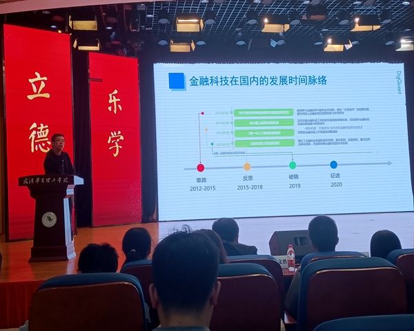 深圳点宽网络科技有限公司董事长黄嵩对“金融科技行业发展趋势与就业前景”这一主题作出了发言。他从金融科技在国际上的主要发展现状、国内外对比及其在中国等方面进行了细致的讲解,不仅让金融科技专业的同学对此有了更深入的理解,也让其他不同专业的同学对这一方面有所了解。