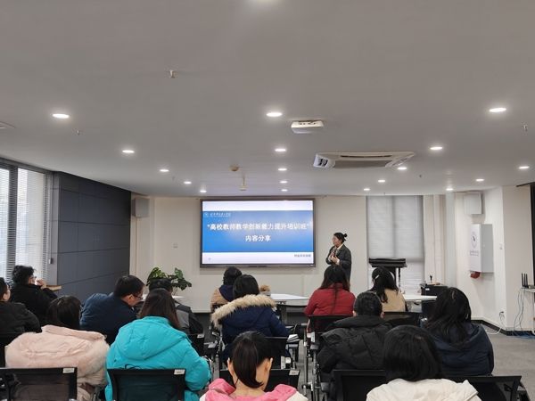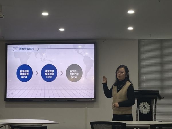吴安妮老师围绕“高校教师教学创新能力提升培训班”的培训内容,向各位老师就高校教师教学创新大赛的参赛要点做出汇报。汇报围绕教学创新成果报告、课堂教学实录视频、教学设计创新汇报、申报书等参赛资料展开,传达此次培训过程中的关键要点。